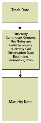如果从2025年1月29日开始的任何季度赎回观察日,每份标的的收盘价等于或高于其初始价格,这些票据将被自动赎回。2025年1月29日及之后的每个票息确定日也将是一个通知观察日。如果票据被自动调用,您将不会收到我们的任何通知。