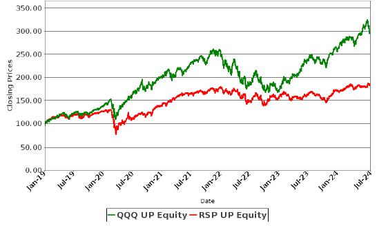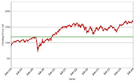 下图展示的是2019年1月1日至2024年7月29日期间,基于彭博报道的每日收盘价的RSP表现,未经独立核实。我们没有对来自彭博的公开信息进行任何独立审查或尽职调查。2024年7月29日,RSP的收盘价为169.97美元,这是它的初始价格。绿线表示其息票障碍和下行阈值为118.98美元,相当于其初始价格的70.00%。RSP的历史表现不应被视为其未来表现的指示,也不能对票据期限内任何时间,包括票面利率确定日的RSP价格作出任何保证。我们无法向您保证,由于RSP的履行将导致您的任何投资获得回报。