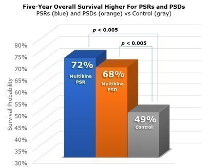 与对照组相比,我们仅证明MultiKine可能导致PSRS和PSDs是不够的,CEL-SCI还必须测试PSRS和PSDs是否会导致生存率的提高。CEL-SCI的III期试验表明,PSR患者有72%的可能性在五年后还活着,而对照患者只有49%左右的可能性在五年后还活着。PSD患者在CEL-SCI的III期试验中看到了类似的改善。他们5年的生存几率约为68%。因此,CEL-SCI认为,III期试验表明,那些因多因子而出现PSR或PSD的患者比未接受多因子治疗的患者寿命更长。需要注意的是,这些结果来自整个III期研究人群,而不是来自一个亚组。对于PSR患者(蓝色)、PSD患者(橙色)和未接受Multikine(灰色)的对照患者,至少能活五年的可能性如下图所示。