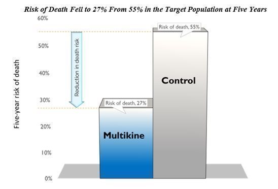 Multikine将目标人群的5年死亡风险降低了一半。CEL-SCI的结果表明,在目标人群中,与对照组相比,Multikine可以在五年内将死亡风险降低一半。五年时,存活率从对照组的45%增加到Multikine组的73%。这意味着Multikine组的死亡风险从对照组的55%降至27%,如下图所示。
