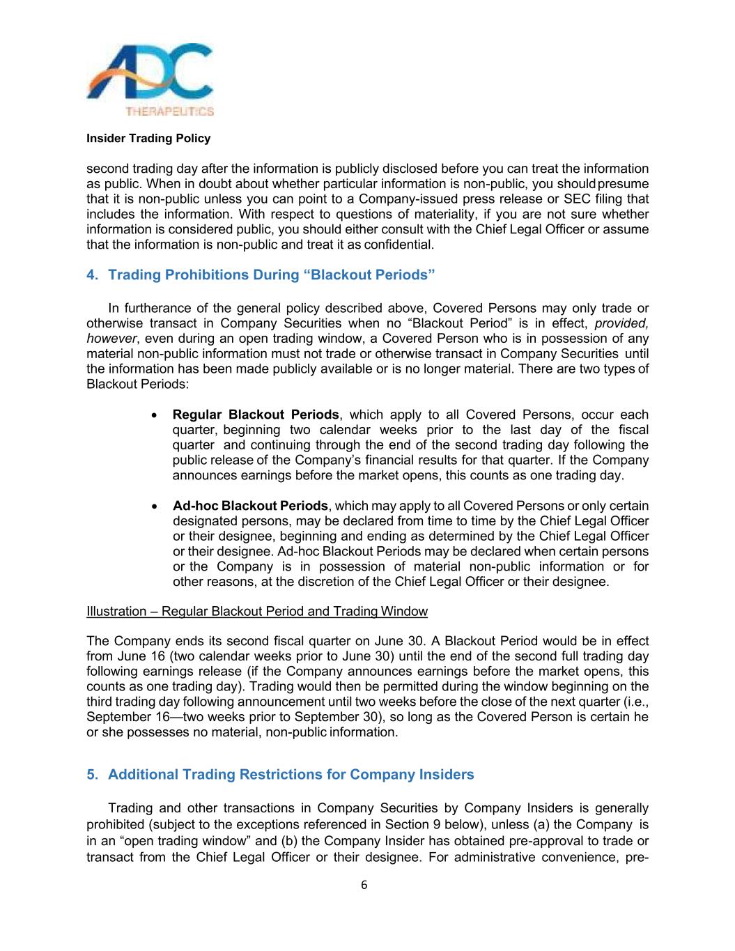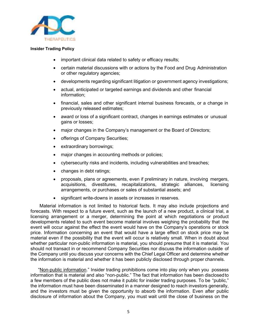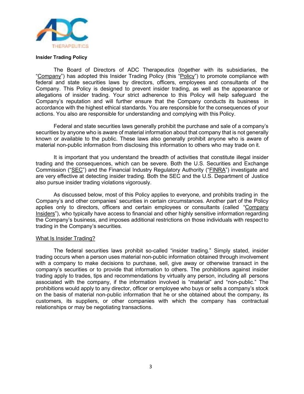 内幕交易政策3 ADC Therapeutics(连同其附属公司,“公司”)的董事会已采纳此内幕交易政策(此“政策”),以促进公司董事、高级职员、雇员和顾问遵守联邦和州证券法。这项政策旨在防止内幕交易,以及内幕交易的出现或指控。贵司严格遵守本政策,将有利于维护公司声誉,并将进一步确保公司按照最高道德标准开展业务。你要为自己行为的后果负责。你也有责任理解和遵守这个政策。联邦和州证券法一般禁止任何知道公众一般不知道或无法获得的有关该公司的重要信息的人购买和出售该公司的证券。这些法律还普遍禁止任何知悉重大非公开信息的人向可能利用这些信息进行交易的其他人披露这些信息。重要的是,要了解构成非法内幕交易的活动的广度和后果,这些活动可能很严重。美国证券交易委员会(“SEC”)和金融业监管局(“FINRA”)都在调查,在侦测内幕交易方面非常有效。SEC和美国司法部也都在大力追究内幕交易违规行为。如下文所述,本政策大部分适用于所有人,并在某些情况下禁止买卖本公司及其他公司的证券。该政策的另一部分仅适用于董事、高级职员和某些雇员或顾问(称为“公司内部人士”),他们通常可以获得有关公司业务的财务和其他高度敏感信息,并对这些个人在交易公司证券方面施加额外限制。什么是内幕交易?联邦证券法禁止所谓的“内幕交易”。简单地说,内幕交易是指某人利用通过参与一家公司而获得的重大非公开信息,作出购买、出售、赠送或以其他方式交易该公司证券或向他人提供该信息的决定。内幕交易禁令适用于几乎任何人的交易、提示和推荐,包括与公司有关联的所有人,如果涉及的信息是“重大的”和“非公开的”。这些禁令将适用于任何董事、高级管理人员或雇员,如果他或她根据获得的有关该公司、其客户、其供应商或与该公司有合同关系或可能正在谈判交易的其他公司的重大非公开信息而买卖该公司的股票。