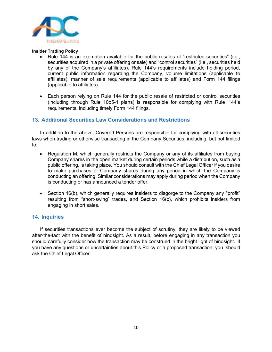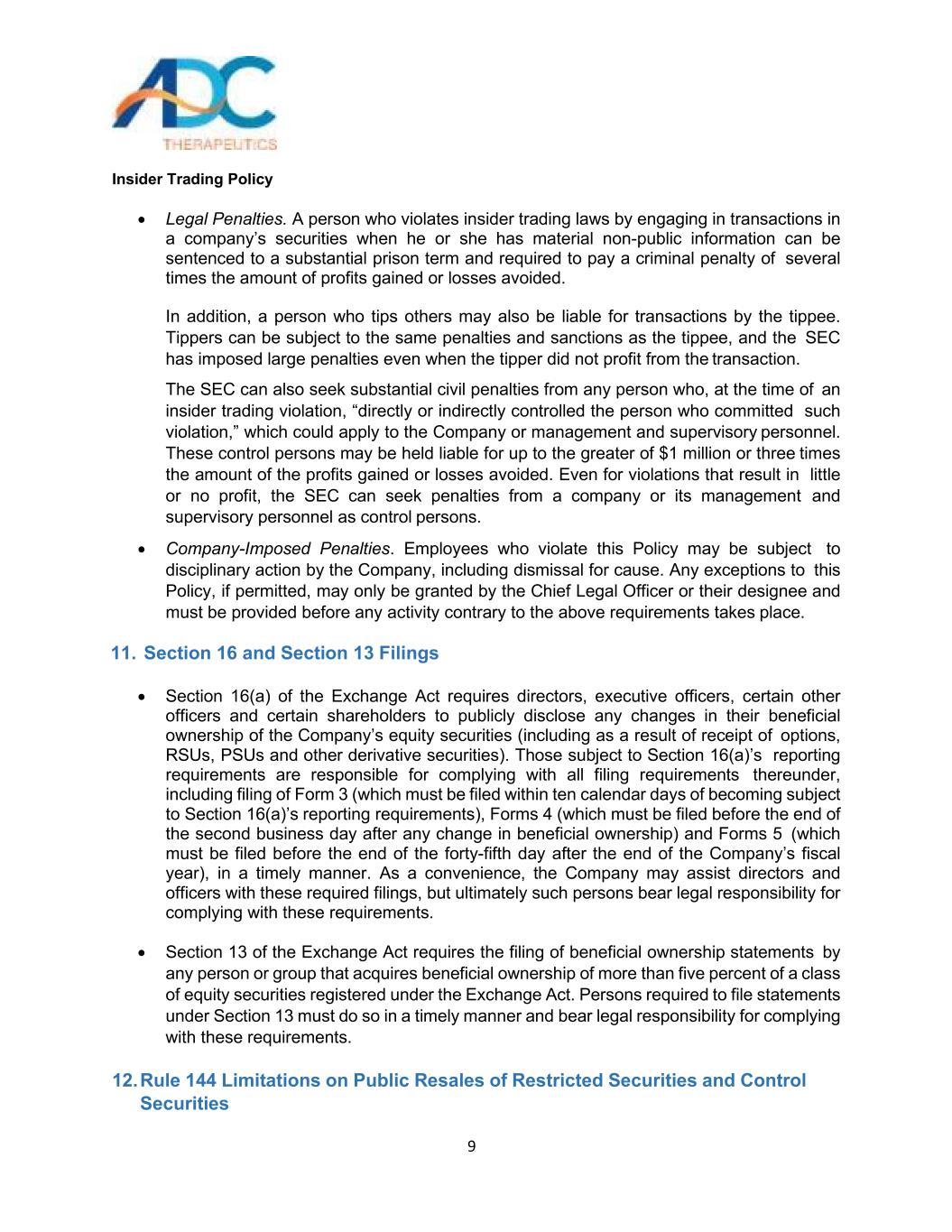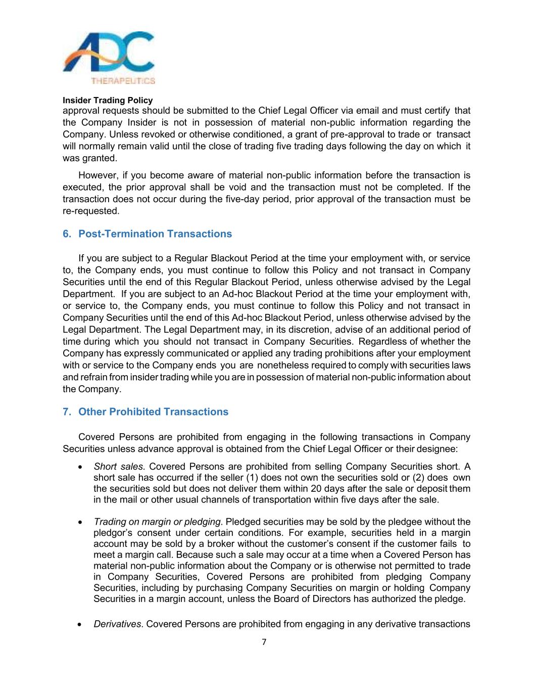 内幕交易政策3 ADC Therapeutics(连同其附属公司,“公司”)的董事会已采纳此内幕交易政策(此“政策”),以促进公司董事、高级职员、雇员和顾问遵守联邦和州证券法。这项政策旨在防止内幕交易,以及内幕交易的出现或指控。贵司严格遵守本政策,将有利于维护公司声誉,并将进一步确保公司按照最高道德标准开展业务。你要为自己行为的后果负责。你也有责任理解和遵守这个政策。联邦和州证券法一般禁止任何知道公众一般不知道或无法获得的有关该公司的重要信息的人购买和出售该公司的证券。这些法律还普遍禁止任何知悉重大非公开信息的人向可能利用这些信息进行交易的其他人披露这些信息。重要的是,要了解构成非法内幕交易的活动的广度和后果,这些活动可能很严重。美国证券交易委员会(“SEC”)和金融业监管局(“FINRA”)都在调查,在侦测内幕交易方面非常有效。SEC和美国司法部也都在大力追究内幕交易违规行为。如下文所述,本政策大部分适用于所有人,并在某些情况下禁止买卖本公司及其他公司的证券。该政策的另一部分仅适用于董事、高级职员和某些雇员或顾问(称为“公司内部人士”),他们通常可以获得有关公司业务的财务和其他高度敏感信息,并对这些个人在交易公司证券方面施加额外限制。什么是内幕交易?联邦证券法禁止所谓的“内幕交易”。简单地说,内幕交易是指某人利用通过参与一家公司而获得的重大非公开信息,作出购买、出售、赠送或以其他方式交易该公司证券或向他人提供该信息的决定。内幕交易禁令适用于几乎任何人的交易、提示和推荐,包括与公司有关联的所有人,如果涉及的信息是“重大的”和“非公开的”。这些禁令将适用于任何董事、高级管理人员或雇员,如果他或她根据获得的有关该公司、其客户、其供应商或与该公司有合同关系或可能正在谈判交易的其他公司的重大非公开信息而买卖该公司的股票。