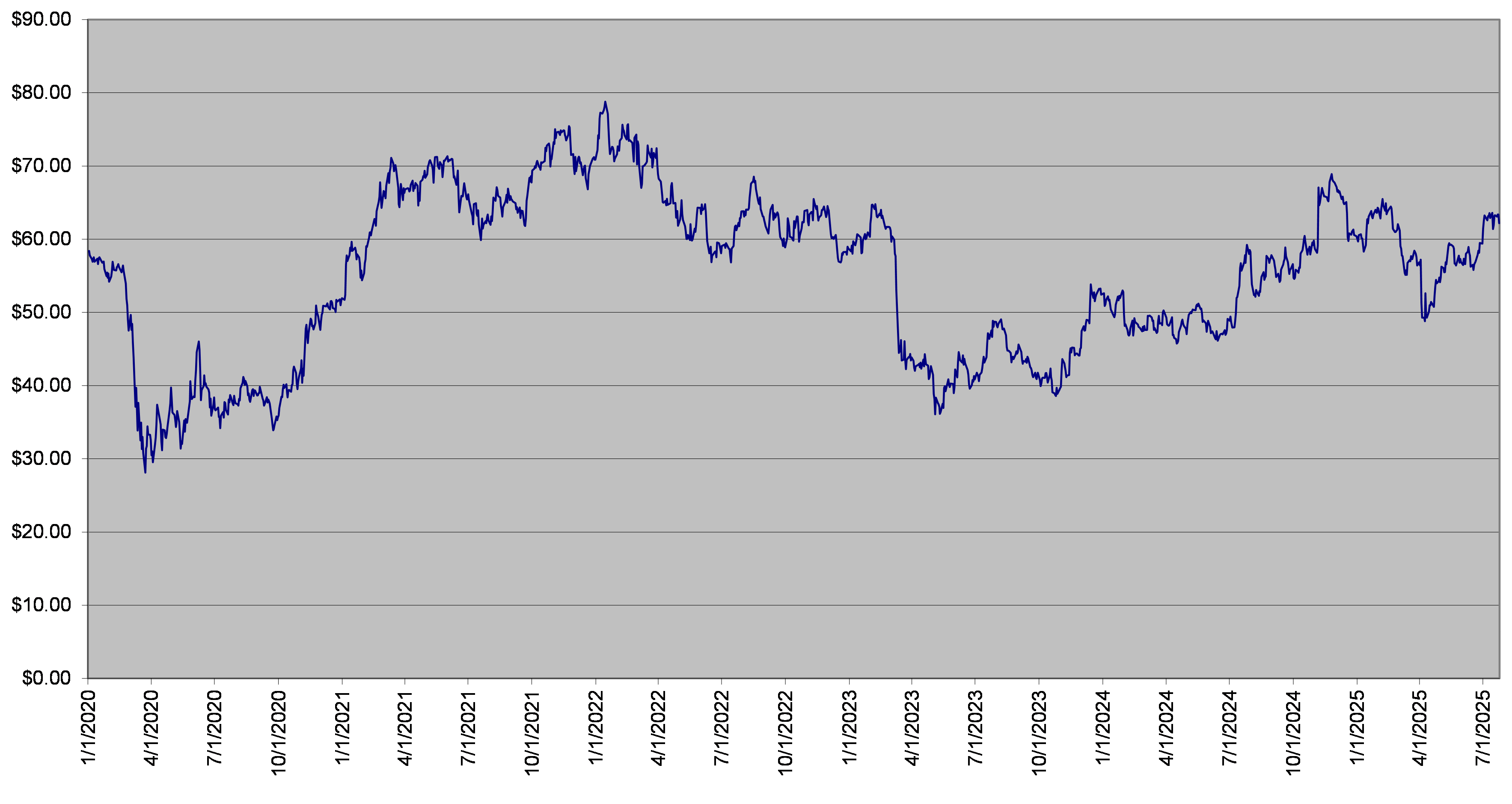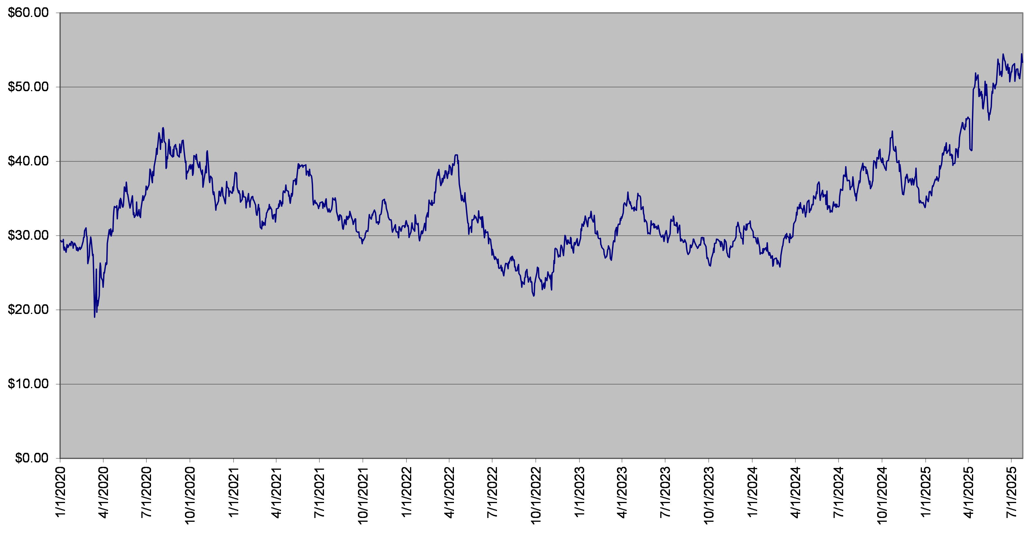 | KRE指数每日收盘水平 2020年1月1日至2025年7月24日 |