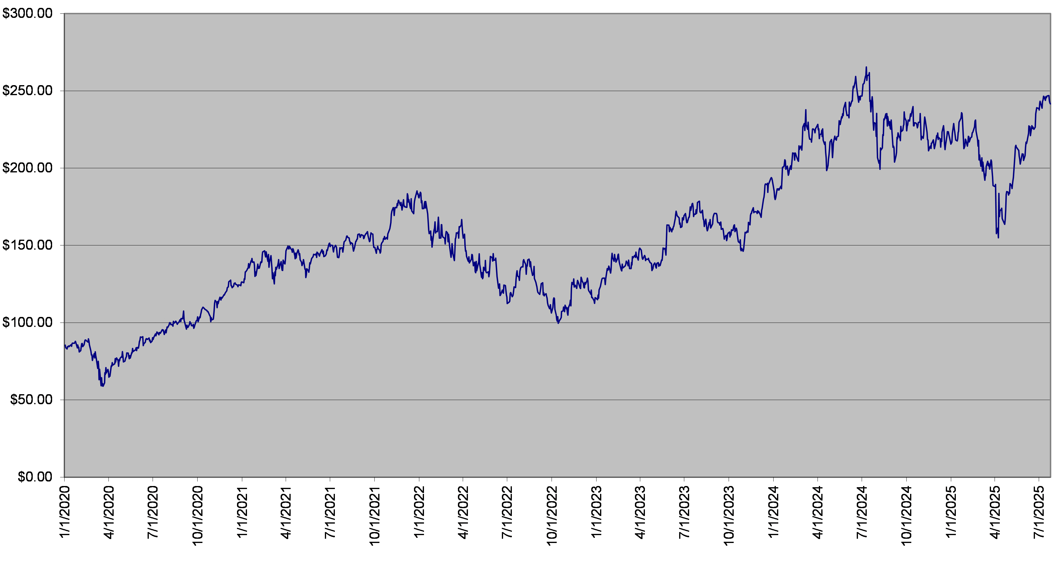 | SOXX基金日收盘水平 2020年1月1日至2025年7月24日 |