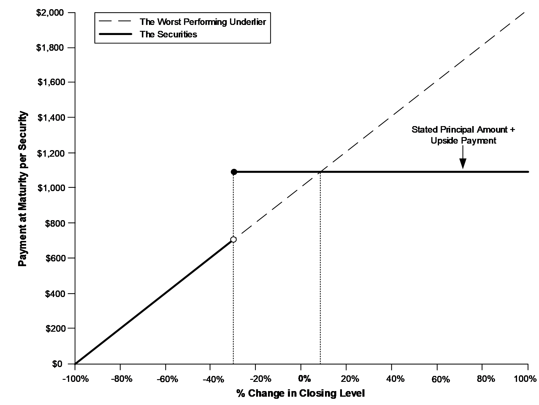 到期付款将完全基于表现最差的底层证券的表现,这可能是底层证券。下面的收益图说明了在证券期限内表现最差的基础资产的一系列假设表现的到期付款,基于以下条款: