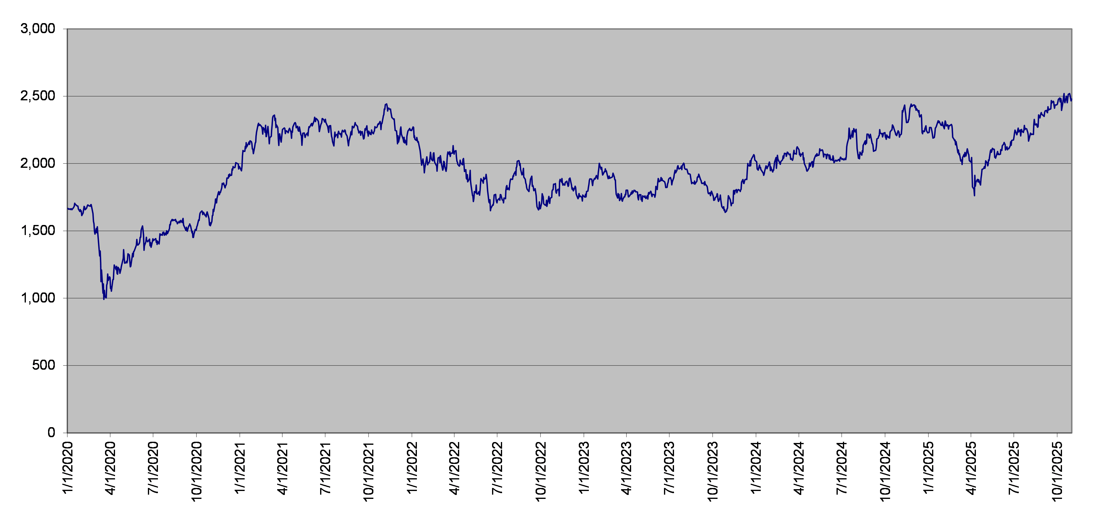 | RTY指数每日收盘水平 2020年1月1日至2025年10月31日 |