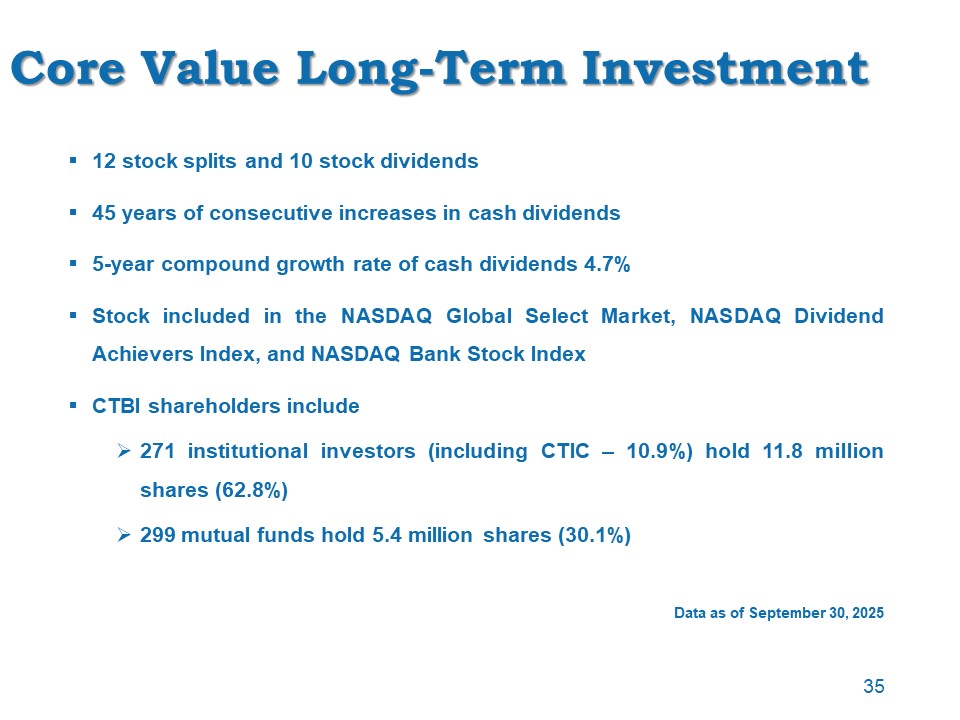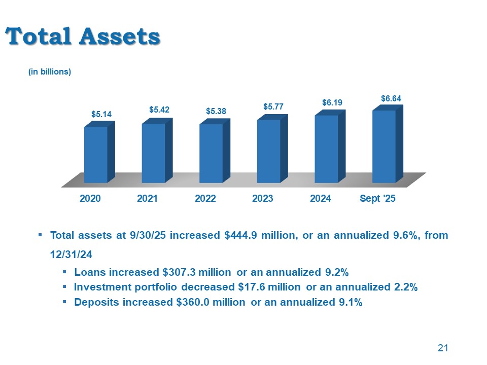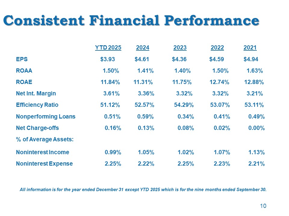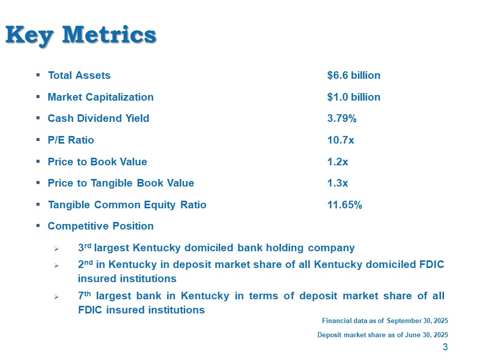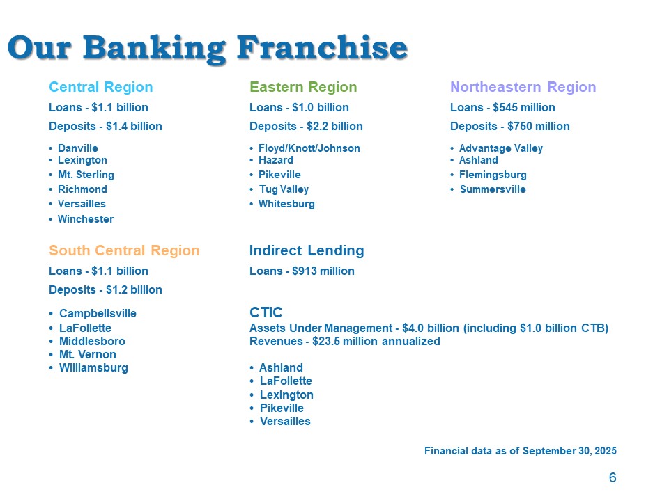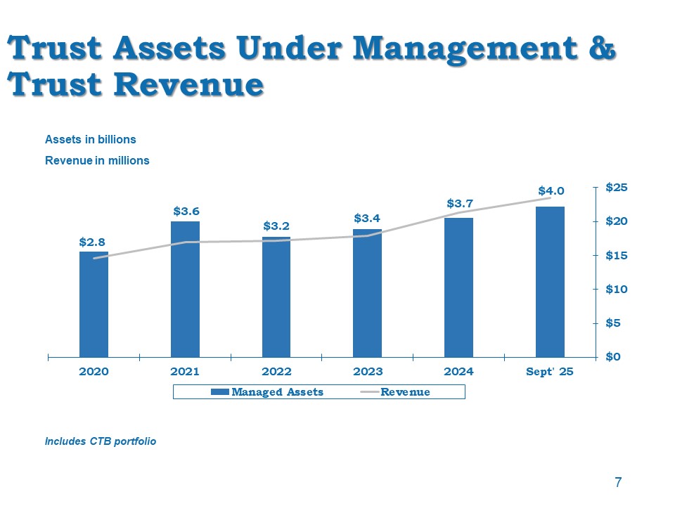我们的银行业务特许中部地区东部地区东北部地区贷款-11亿美元贷款-10亿美元贷款-5.45亿美元存款-14亿美元存款-22亿美元存款-7.5亿美元•丹维尔•弗洛伊德/诺特/约翰逊•优势谷•列克星敦•哈扎德•阿什兰•斯特林山•派克维尔•弗莱明斯堡•里士满•拖格谷•萨默斯维尔•凡尔赛•怀特斯堡•温彻斯特中南部地区间接贷款-11亿美元贷款-9.13亿美元存款-12亿美元•坎贝尔斯维尔CTIC •拉福莱特管理资产-40亿美元(包括10亿美元CTB)•米德尔斯伯勒收入-年化2350万美元• Mt. Vernon •威廉斯堡•阿什兰• LaFollette •列克星敦• Pikeville • Versailles截至2025年9月30日的财务数据6