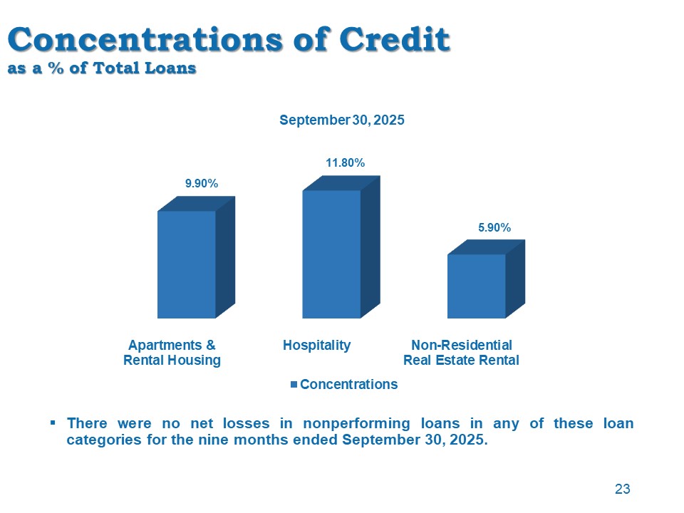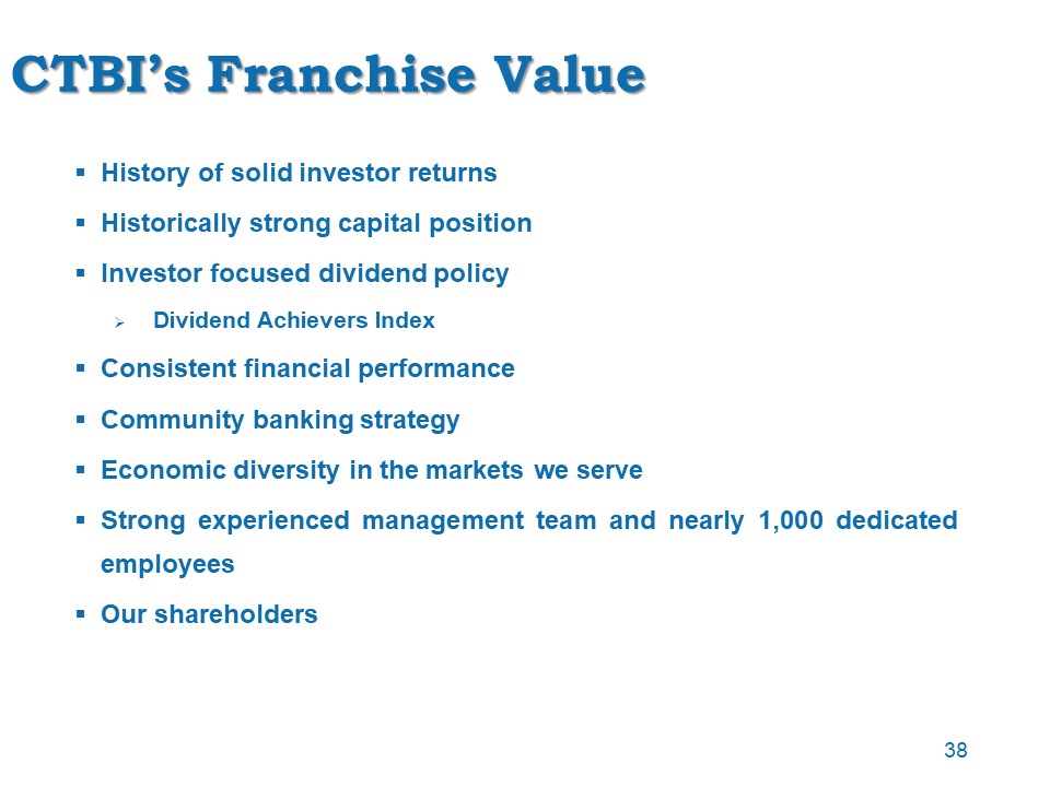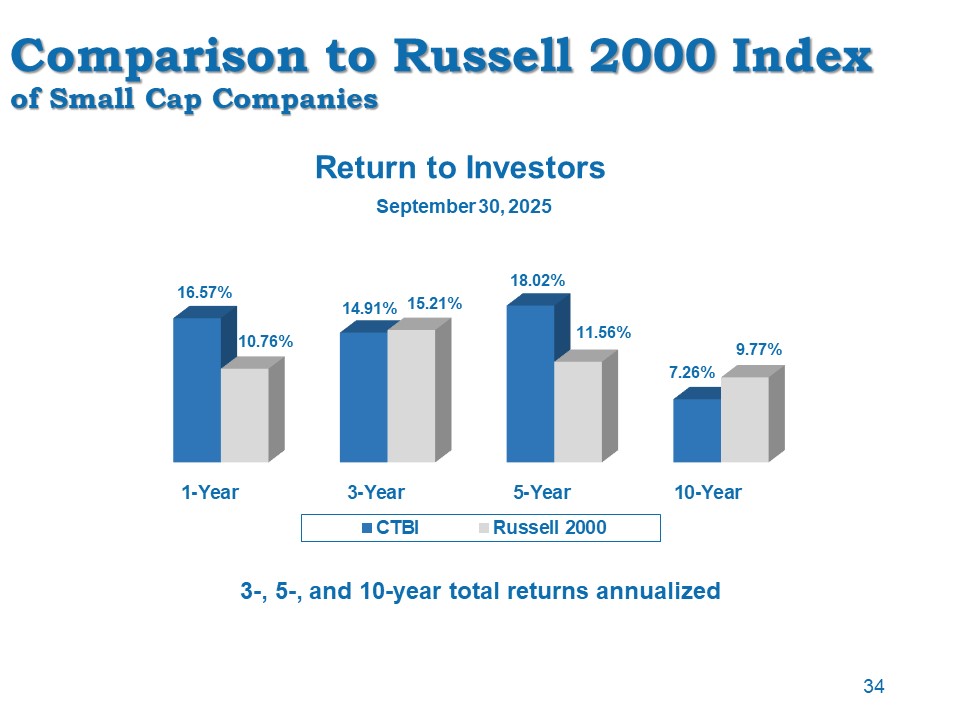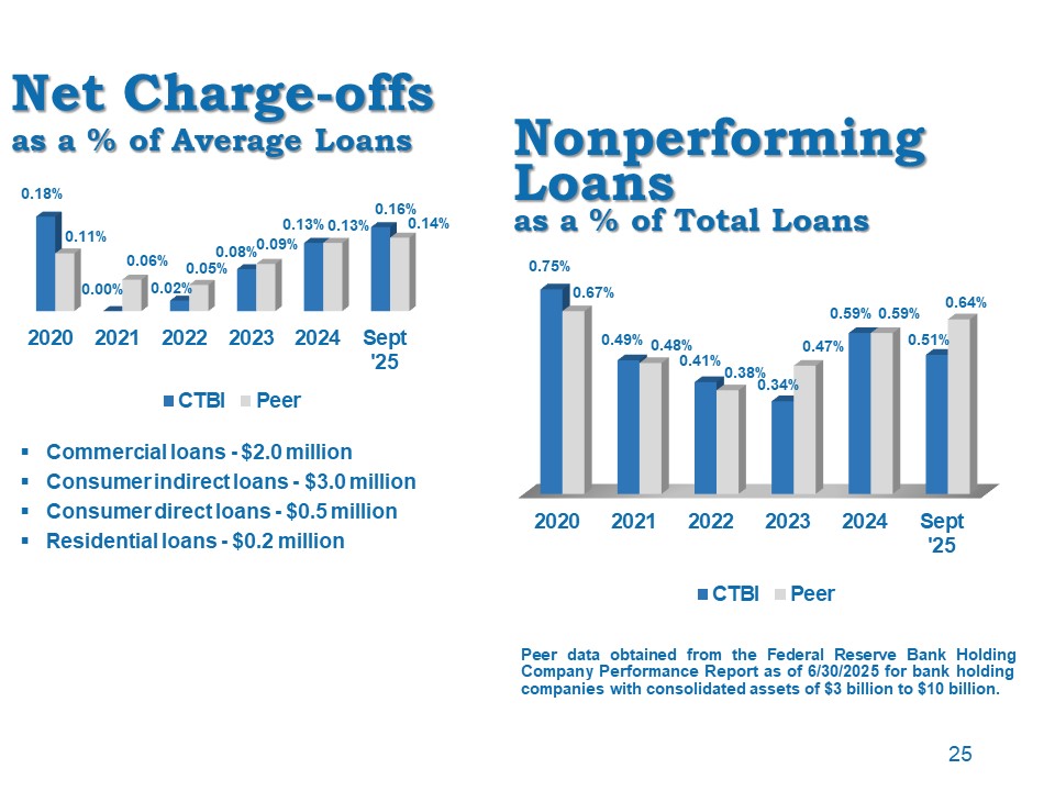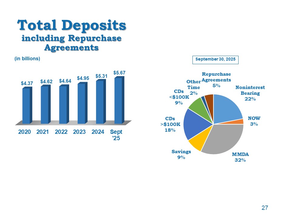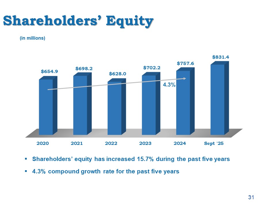 我们的银行业务特许中部地区东部地区东北部地区贷款-11亿美元贷款-10亿美元贷款-5.45亿美元存款-14亿美元存款-22亿美元存款-7.5亿美元•丹维尔•弗洛伊德/诺特/约翰逊•优势谷•列克星敦•哈扎德•阿什兰•斯特林山•派克维尔•弗莱明斯堡•里士满•拖格谷•萨默斯维尔•凡尔赛•怀特斯堡•温彻斯特中南部地区间接贷款-11亿美元贷款-9.13亿美元存款-12亿美元•坎贝尔斯维尔CTIC •拉福莱特管理资产-40亿美元(包括10亿美元CTB)•米德尔斯伯勒收入-年化2350万美元• Mt. Vernon •威廉斯堡•阿什兰• LaFollette •列克星敦• Pikeville • Versailles截至2025年9月30日的财务数据6