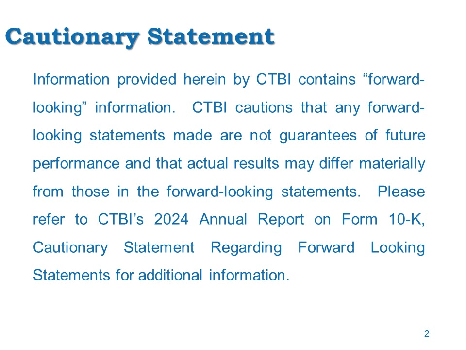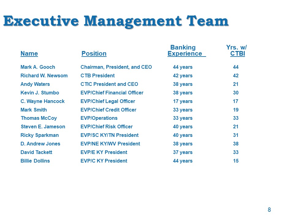 执行管理团队Banking Yrs. w/name职位经验CTBIMark A. Gooch董事长、总裁,兼首席执行官44年44年Richard W. Newsom CTB总裁42年42 Andy Waters CTIC总裁兼首席执行官38年21 Kevin J. Stumbo执行副总裁/首席财务官 38年30丨C. Wayne Hancock C. Wayne Hancock执行副总裁/首席法务官17年17 Mark Smith执行副总裁/首席信用官33年19 Thomas McCoy执行副总裁/运营33年33 Steven E. Jameson执行副总裁/首席风险官40年21 Ricky Sparkman执行副总裁/SC KY/TN总裁40年31 TERM0 Andrew Jones D. Andrew Jones执行副总裁/NE KY/WV总裁38年38 David Tackett执行副总裁/E KY总裁37年33 Billie Dollins执行副总裁/C KY总裁44年158