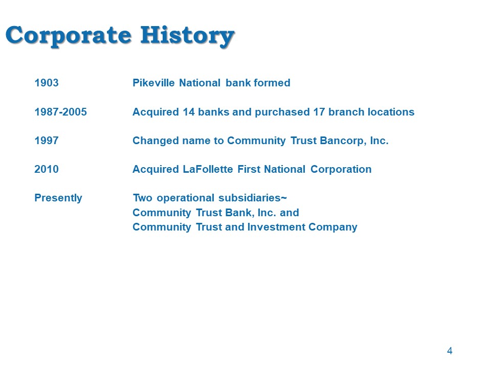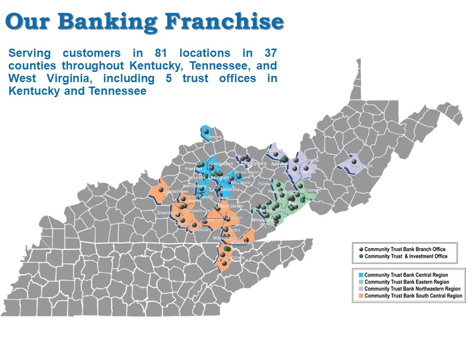 公司历史1903 Pikeville National Bank formed 1987-2005收购14家银行并购买17家分行1997年更名为Community Trust Bancorp, Inc. 2010收购LaFollette First National Corporation目前有两家运营子公司~Community Trust Bank,Inc.和Community Trust and Investment Company 4