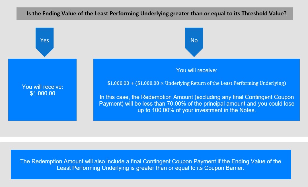 在这种情况下,赎回金额(不包括任何最终或有息票支付)将低于本金额的70.00%,您可能会损失高达100.00%的票据投资。