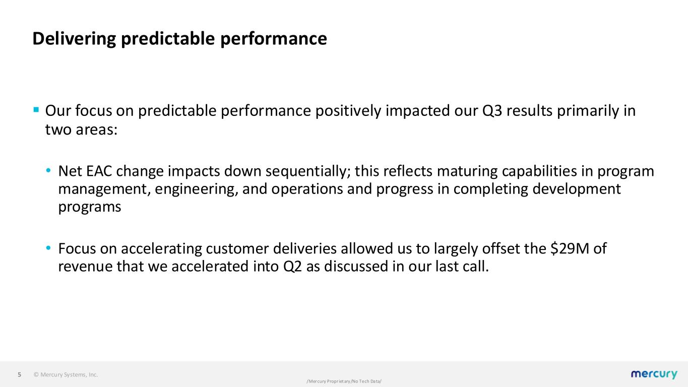 ©Mercury Systems, Inc./Mercury Proprietary/没有美国技术数据/提供可预测的性能▪我们对可预测业绩的关注主要在两个领域对我们的第三季度业绩产生了积极影响:•净EAC变化影响依次下降;这反映了项目管理、工程和运营方面的成熟能力以及完成开发计划的进展•专注于加速客户交付使我们能够在很大程度上抵消我们在上次电话会议中讨论的进入第二季度加速的2900万美元收入。5