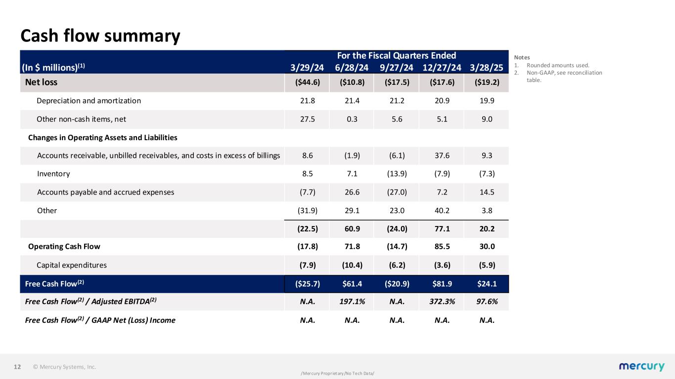©Mercury Systems, Inc./Mercury Proprietary/No 美国技术数据/截至本财季业绩(百万美元)(1)3/29/246/28/249/27/2412/27/243/28/25净亏损($ 44.6)($ 10.8)($ 17.5)($ 17.6)($ 19.2)折旧和摊销21.82 1.42 1.22 0.9 19.9其他非现金项目净额27.5 0.35.65.19.0经营资产和负债变动应收账款、未开票应收账款,和超过账单的成本8.6(1.9)(6.1)37.69.3存货8.57.1(13.9)(7.9)(7.3)应付账款和应计费用(7.7)26.6(27.0)7.21 4.5其他(31.9)29.12 3.04 0.2 3.8(22.5)60.9(24.0)77.12 0.2经营现金流(17.8)71.8(14.7)85.53 0.0资本支出(7.9)(10.4)(6.2)(3.6)(5.9)自由现金流(2)($ 25.7)$ 61.4($ 20.9)$ 81.9 $ 24.1自由现金流(2)/调整后EBITDA(2)N.A. 197.1% N.A. 37 2.3% 97.6%自由现金流(2)/GAAP净(亏损)收入N.A. N.A. N.A. N.A.注1。使用的四舍五入数量。2.非GAAP,见调节表。现金流概要12