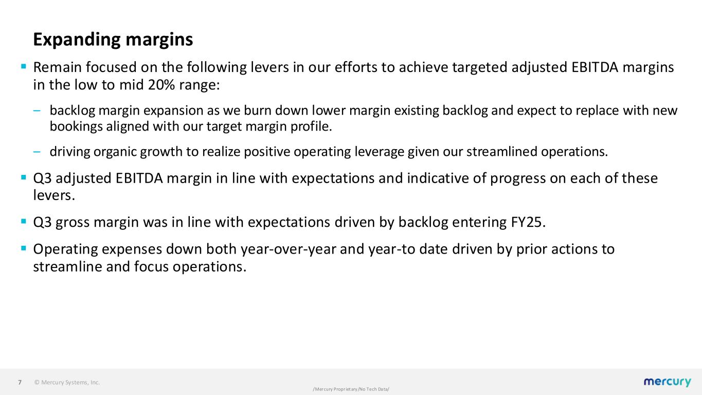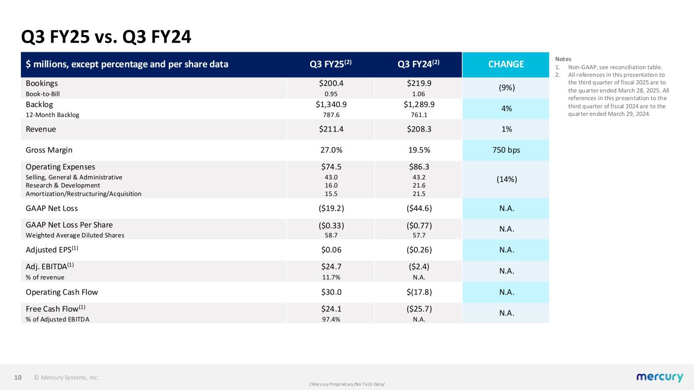 ©Mercury Systems, Inc./Mercury Proprietary/No 美国技术数据/百万美元,百分比和每股数据除外Q3 FY25(2)Q3 FY24(2)CHANGE Bookings $ 200.4 $ 219.9(9%)Book-to-Bill 0.95 1.06 Backlog $ 1,340.9 $ 1,289.94% 12个月Backlog 787.676 1.1 Revenue $ 211.4 $ 208.31% Gross Margin 27.0% 19.5% 750 bps Operating Expenses $ 74.5 $ 86.3(14%)Selling,一般与行政43.04 3.2研发16.02 1.6摊销/重组/收购15.52 1.5 GAAP净亏损(19.2美元)(44.6美元)N.A. GAAP每股净亏损(0.33美元)(0.77美元)N.A.加权平均稀释股份58.75 7.7调整后每股收益(1)0.06美元(0.26美元)N.A.调整后EBITDA(1)24.7美元(2.4美元)N.A.占收入的11.7% N.A.经营现金流$ 30.0 $(17.8)N.A.自由现金流(1)24.1美元(25.7美元)N.A.占调整后EBITDA的97.4% N.A.注1。非GAAP,见调节表。2.本演示文稿中对2025财年第三季度的所有提及均指截至2025年3月28日的季度。本演示文稿中对2024财年第三季度的所有提及均指截至2024年3月29日的季度。25财年第三季度与24财年第三季度10