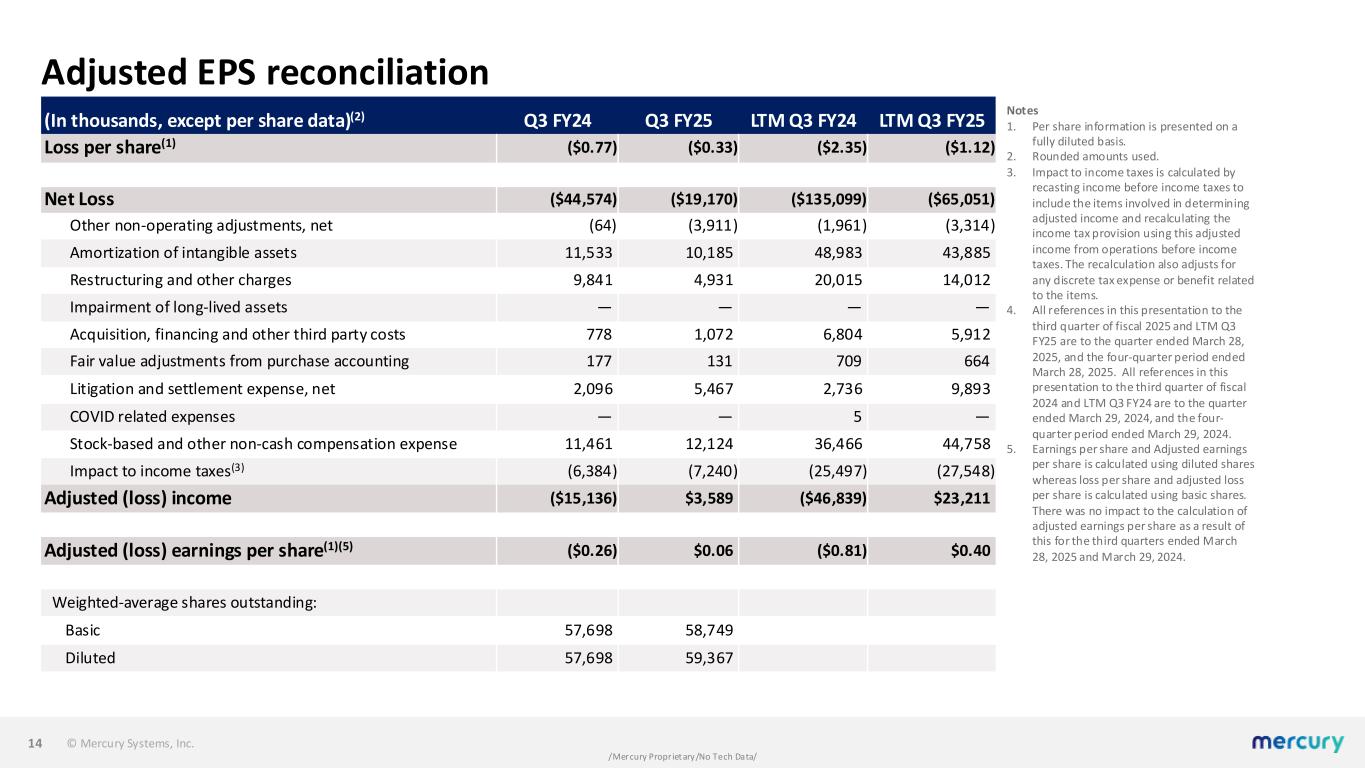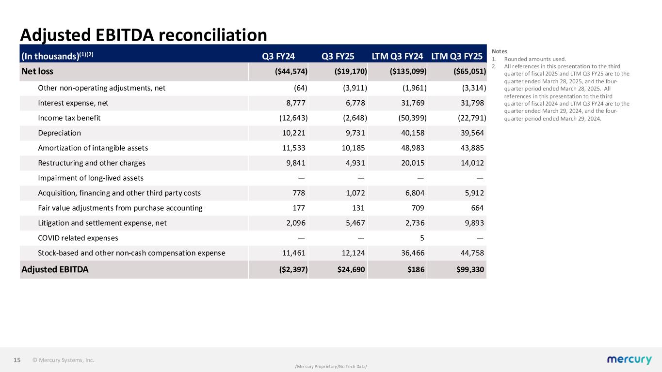 ©Mercury Systems, Inc./Mercury Proprietary/No 美国技术数据/(单位:千,每股数据除外)(2)Q3 FY24 Q3 Q3 FY25 LTM Q3 FY24 LTM Q3 FY25 Q3 FY25每股亏损(1)($ 0.77)($ 0.33)($ 2.35)($ 1.12)净亏损($ 44,574)($ 19,170)($ 135,099)($ 65,051)其他非经营调整,净额(64)(3,911)(1,961)(3,314)无形资产摊销11,53310,18548,98343,885重组及其他费用9,8414,93120,01514,012长期资产减值————收购、融资及其他第三方成本7781,0726,8045,912采购会计的公允价值调整177131净额2,0965,4672,7369,893新冠疫情相关费用—— 5 ——股票和其他非现金补偿费用11,46112,12436,46644,758对所得税的影响(3)(6,384)(7,240)(25,497)(27,548)调整后(亏损)收入(15,136美元)3,589美元(46,839美元)23,211美元调整后(亏损)每股收益(1)(5)(0.26美元)0.06美元(0.81美元)0.40美元加权平均流通股:基本57,69858,749稀释后57,69859,367注1。每股信息在完全稀释的基础上呈现。2.使用的四舍五入数量。3.对所得税的影响是通过重铸所得税前收入来计算的,以包括确定调整后收入所涉及的项目,并使用这一调整后的所得税前营业收入重新计算所得税准备金。重新计算还会针对与项目相关的任何离散税收费用或福利进行调整。4.本演示文稿中对2025财年第三季度和LTM25财年第三季度的所有提及均指截至2025年3月28日的季度,以及截至2025年3月28日的四个季度期间。本演示文稿中对2024财年第三季度和LTM24财年第三季度的所有提及均指截至2024年3月29日的季度和截至2024年3月29日的第四季度。5.每股收益和调整后每股收益使用稀释股份计算,而每股亏损和调整后每股亏损使用基本股份计算。截至2025年3月28日和2024年3月29日的第三季度,调整后每股收益的计算没有因此受到影响。调整后每股收益调节14