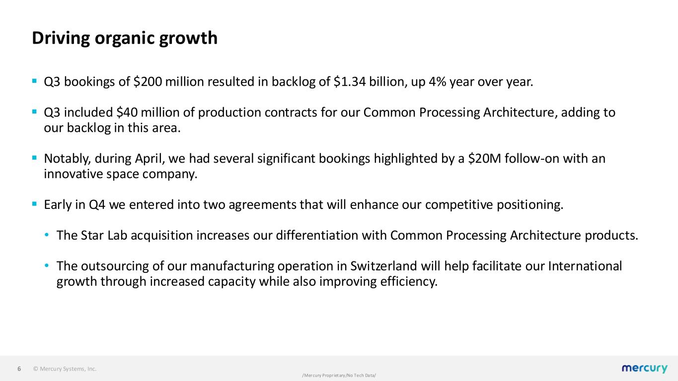 ©Mercury Systems, Inc./Mercury Proprietary/没有美国技术数据/推动有机增长▪Q3预订量为2亿美元,导致积压13.4亿美元,同比增长4%。▪第三季度包括4000万美元的通用处理架构生产合同,增加了我们在这一领域的积压工作。▪值得注意的是,在4月份,我们有几笔重要的预订,其中突出的是与一家创新太空公司的2000万美元后续交易。▪在第四季度初,我们签订了两项协议,这将增强我们的竞争地位。• Star Lab收购增加了我们与Common Processing Architecture产品的差异化。•我们在瑞士的制造业务外包将有助于通过增加产能促进我们的国际增长,同时也提高了效率。6