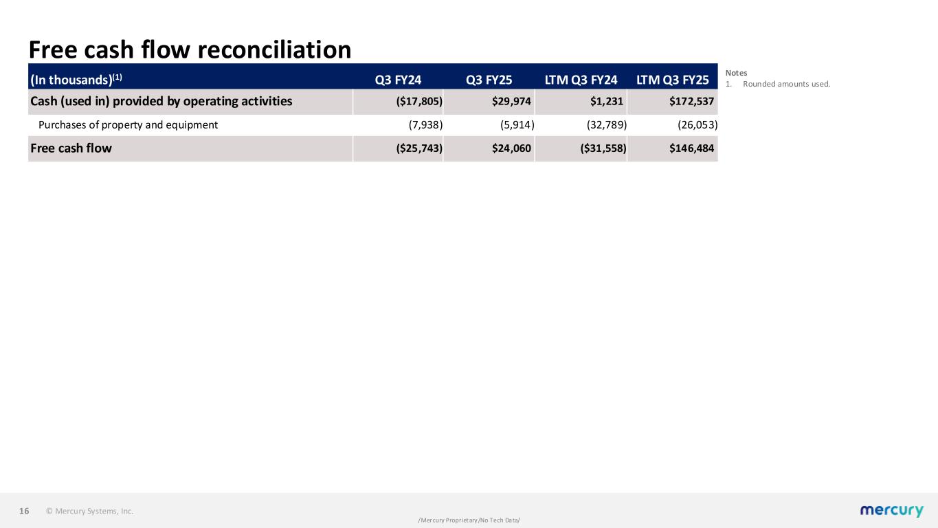 ©Mercury Systems, Inc./Mercury Proprietary/No 美国技术数据/(单位:千)(1)Q3 FY24 Q3 FY25 LTM Q3 FY24 LTM Q3 FY25现金(用于)经营活动(17,805美元)$ 29,974 $ 1,231 $ 172,537购买财产和设备(7,938)(5,914)(32,789)(26,053)自由现金流(25,743美元)$ 24,060(31,558美元)$ 146,484注1。使用的四舍五入数量。自由现金流调节16
