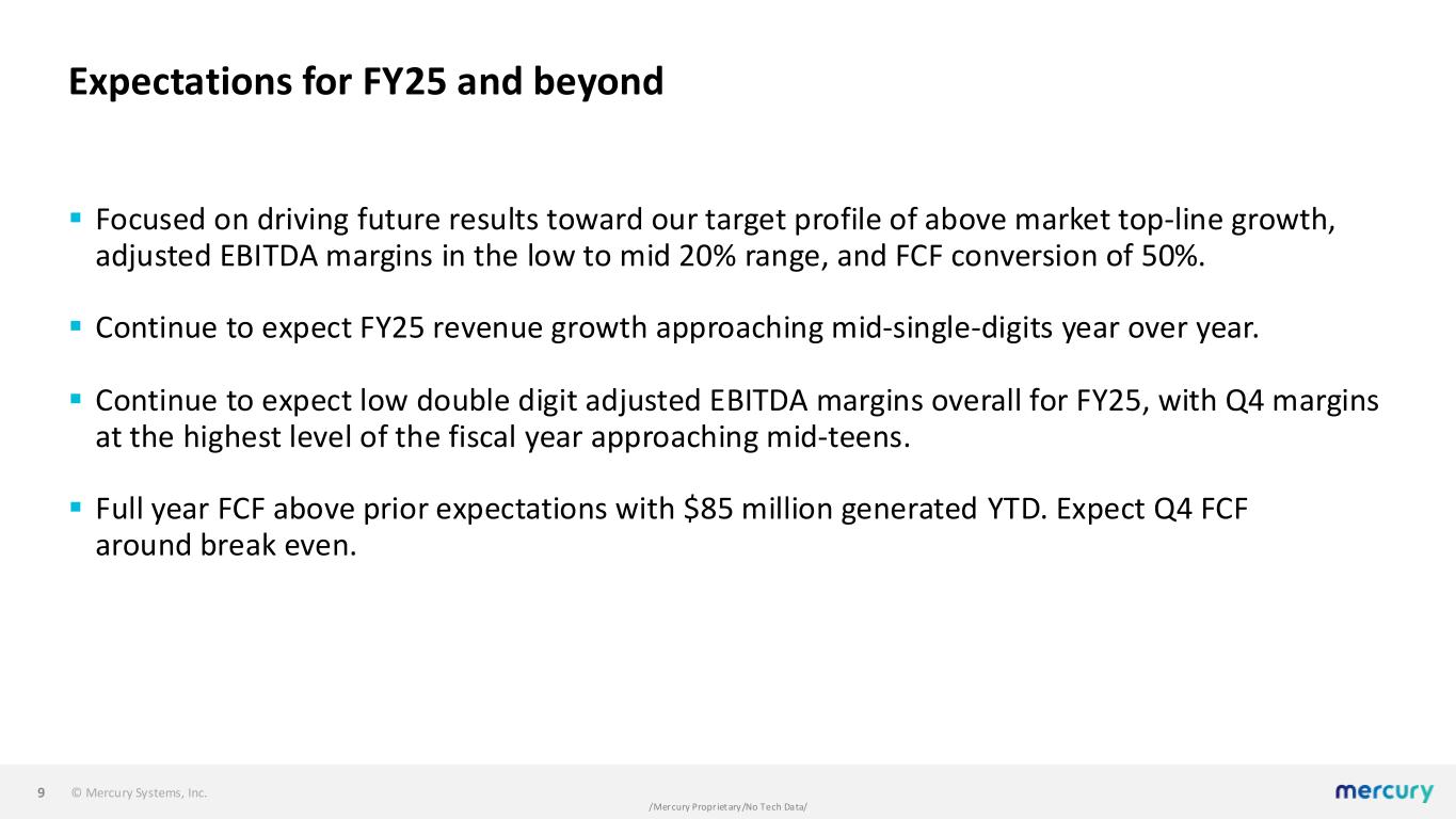 ©Mercury Systems, Inc./Mercury Proprietary/没有美国技术数据/对25财年及以后的预期▪专注于推动未来业绩朝着我们的目标概况:高于市场收入增长,调整后EBITDA利润率在20%的中低范围,以及50%的FCF转换。▪继续预计FY25收入同比增长接近中个位数。▪继续预计25财年整体调整后EBITDA利润率将保持低两位数,Q4利润率处于本财年最高水平,接近十几岁。▪年初至今产生了8500万美元的全年FCF,高于此前预期。预计Q4 FCF在盈亏平衡附近。9