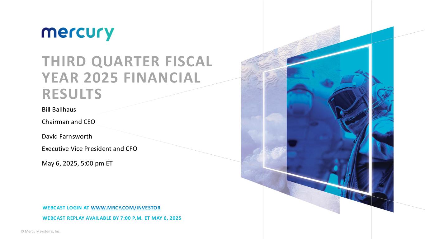 ©www.mrcy.com/investor webcast上的Mercury Systems, Inc.网播登录可在美国东部时间2025年5月6日晚上7:00前获得重播Bill Ballhaus董事长兼首席执行官David Farnsworth执行副总裁兼首席财务官美国东部时间2025年5月6日下午5:00 2025财年第三季度财务业绩1