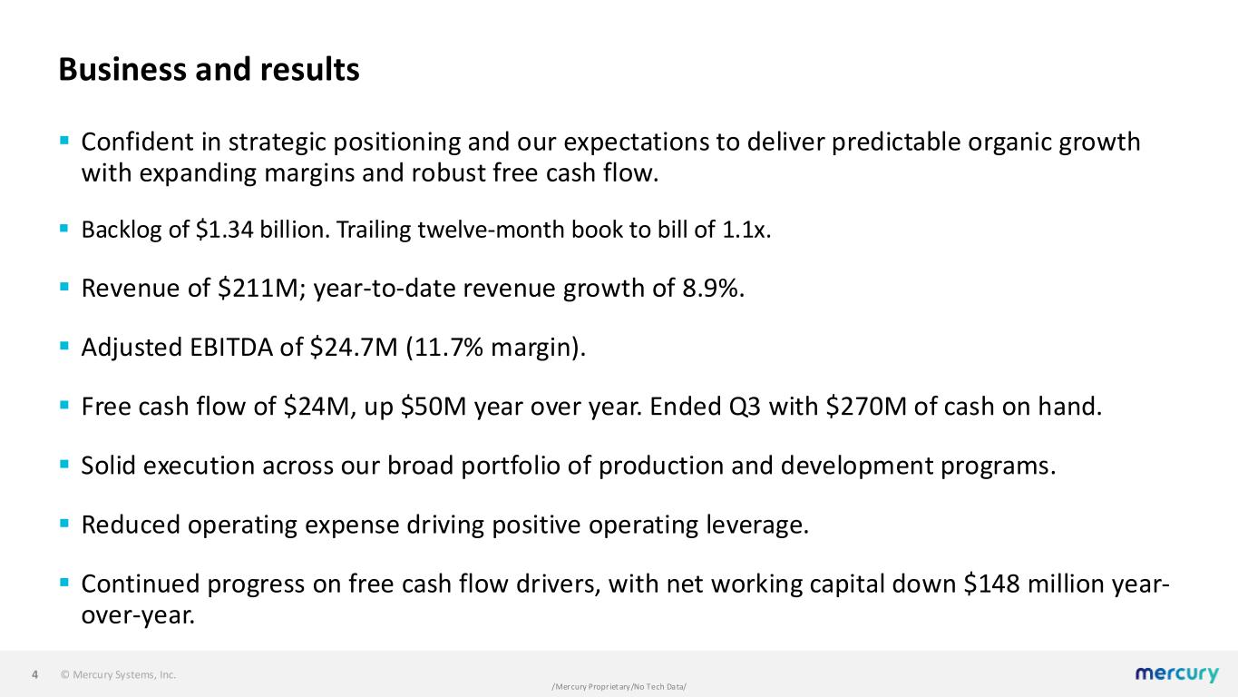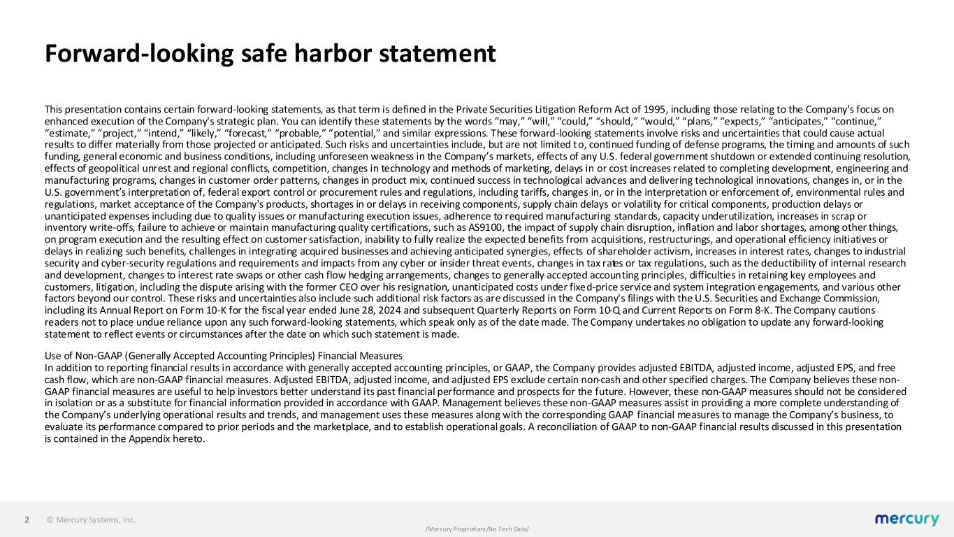 ©Mercury Systems, Inc./Mercury Proprietary/无美国技术数据/前瞻性安全港声明本演示文稿包含某些前瞻性声明,该术语在1995年《私人证券诉讼改革法案》中定义,包括与公司专注于加强执行公司战略计划相关的声明。你可以通过“可能”、“将”、“可能”、“应该”、“将”、“计划”、“预期”、“预期”、“继续”、“估计”、“项目”、“打算”、“可能”、“预测”、“可能”、“潜在”和类似的表达方式来识别这些陈述。这些前瞻性陈述涉及风险和不确定性,可能导致实际结果与预测或预期的结果存在重大差异。此类风险和不确定性包括但不限于国防项目的持续资助、此类资助的时间和金额、总体经济和商业状况,包括公司市场的意外疲软、任何美国联邦政府关闭或延长持续解决方案的影响、地缘政治动荡和区域冲突的影响、竞争、技术和营销方法的变化、与完成开发、工程和制造计划相关的延迟或成本增加、客户订单模式的变化、产品组合的变化、技术进步和交付技术创新的持续成功、变化,或在美国政府对联邦出口管制或采购规则和法规的解释中,包括关税、环境规则和法规的变化或解释或执行、公司产品的市场接受度、组件的短缺或延迟接收、关键组件的供应链延迟或波动、生产延迟或意外费用,包括由于质量问题或制造执行问题、遵守所需的制造标准、产能未充分利用、废料或库存注销增加、未能实现或维持制造质量认证,例如AS9100、供应链中断、通货膨胀和劳动力短缺的影响,除其他外,关于项目执行及其对客户满意度的影响、无法充分实现收购、重组和运营效率举措带来的预期收益或延迟实现此类收益、整合收购业务和实现预期协同效应方面的挑战、股东激进主义的影响、利率上升、工业安全和网络安全法规和要求的变化以及任何网络或内部威胁事件的影响、税率或税收法规的变化,例如内部研发的可抵扣、利率掉期或其他现金流对冲安排的变化,改变公认会计原则、难以留住关键员工和客户、诉讼,包括与前任CEO就其辞职产生的争议、固定价格服务和系统集成业务下的意外成本,以及我们无法控制的各种其他因素。这些风险和不确定性还包括公司提交给美国证券交易委员会的文件中讨论的额外风险因素,包括其截至2024年6月28日的财政年度的10-K表格年度报告以及随后的10-Q表格季度报告和8-K表格当前报告。公司提醒读者不要过分依赖任何此类前瞻性陈述,这些陈述仅在作出之日起生效。公司不承担更新任何前瞻性陈述以反映作出此类陈述之日之后的事件或情况的义务。使用Non-GAAP(公认会计原则)财务指标除了根据公认会计原则或GAAP报告财务业绩外,公司还提供调整后EBITDA、调整后收入、调整后EPS和自由现金流,这是非GAAP财务指标。调整后的EBITDA、调整后的收入和调整后的每股收益不包括某些非现金和其他特定费用。该公司认为,这些非公认会计准则财务指标有助于帮助投资者更好地了解其过去的财务业绩和未来前景。然而,不应孤立地考虑这些非公认会计原则措施,也不应将其作为根据公认会计原则提供的财务信息的替代品。管理层认为,这些非GAAP衡量标准有助于更全面地了解公司的基本运营结果和趋势,管理层将这些衡量标准与相应的GAAP财务衡量标准一起用于管理公司的业务,以评估与前期和市场相比的业绩表现, 并建立运营目标。本演示文稿中讨论的GAAP与非GAAP财务结果的对账包含在附录中。2