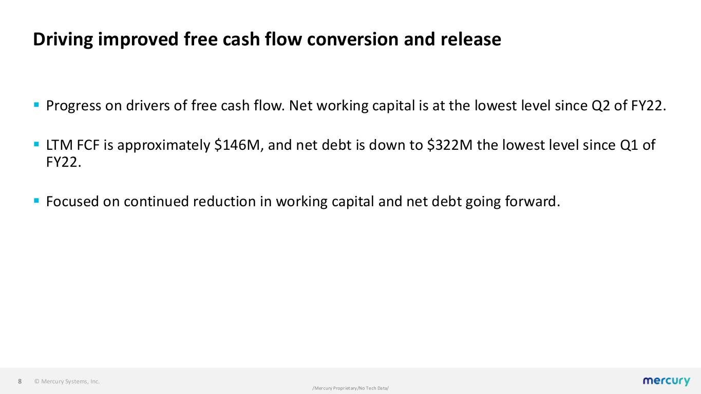 ©Mercury Systems, Inc./Mercury Proprietary/没有美国技术数据/利润率扩大▪在我们努力实现目标调整后EBITDA利润率在20%中低范围的努力中,继续专注于以下杠杆:丨积压利润率扩张,因为我们烧毁了利润率较低的现有积压订单,并期望用与我们的目标利润率状况一致的新预订取而代之。丨鉴于我们的精简运营,推动有机增长以实现积极的经营杠杆。▪第三季度调整后EBITDA利润率符合预期,表明这些杠杆中的每一个都取得了进展。▪Q3毛利率符合预期,受进入25财年的积压订单推动。▪运营费用同比和年初至今均有所下降,这是由于此前采取了精简和集中运营的行动。7