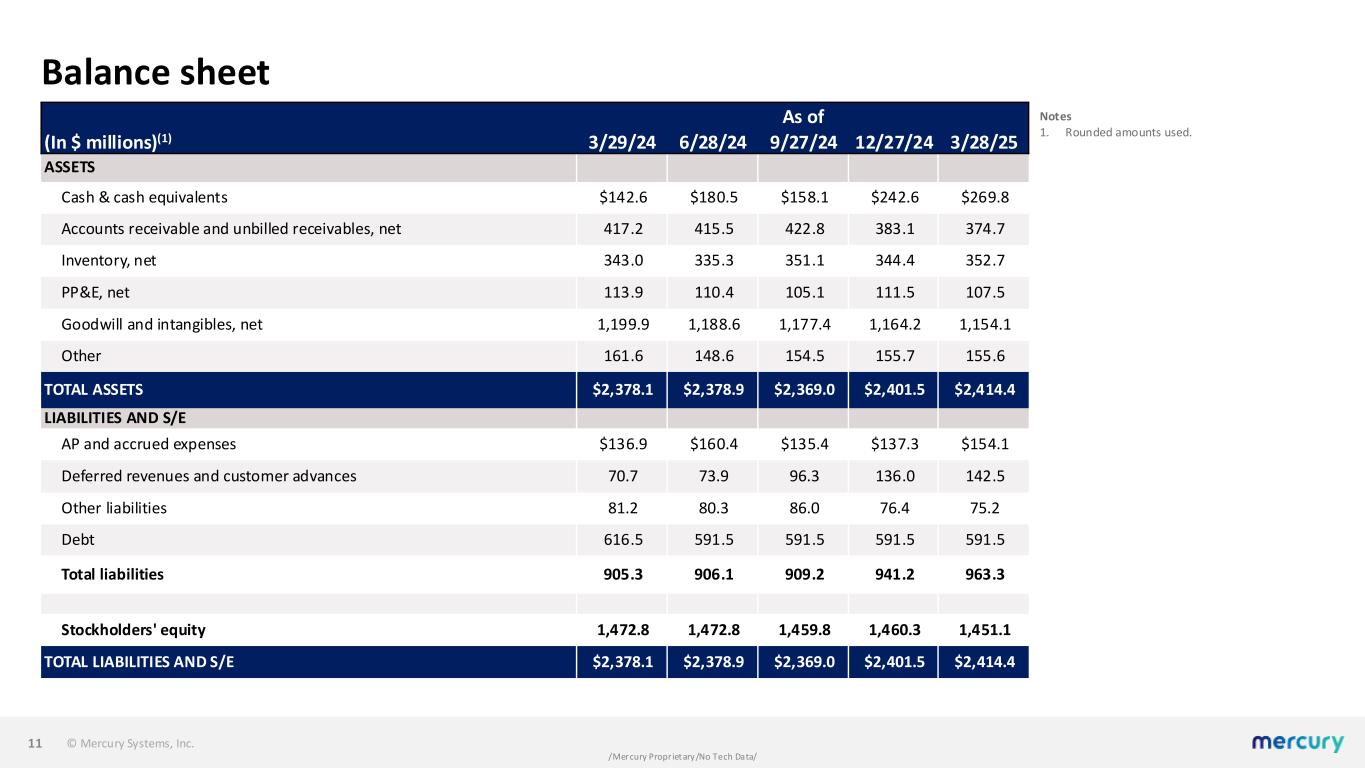 ©Mercury Systems, Inc./Mercury Proprietary/No 美国技术数据/as of(in $ millions)(1)3/29/246/28/249/27/2412/27/243/28/25资产现金及现金等价物$ 142.6 $ 180.5 $ 158.1 $ 242.6 $ 269.8应收账款和未开票的应收账款净额417.24 15.54 22.83 83.13 74.7存货净额343.03 35.33 51.13 44.4352.7 PP & E净额113.91 10.4 105.11 11.5 107.5商誉和无形资产,净额1,199.91,188.61,177.41,164.21,154.1其他161.61 48.61 54.51 55.7 155.6总资产$ 2,378.1 $ 2,378.9 $ 2,369.0 $ 2,401.5 $ 2,414.4负债和S/E AP和应计费用$ 136.9 $ 160.4 $ 135.4 $ 137.3 $ 154.1递延收入和客户垫款70.77 3.996.31 36.01 42.5其他负债81.28 0.386.076.475.2债务616.5591.5591.5591.5591.5591.5总负债905.3909.2941.2963.3股东权益1,472.81,472.81,459.81,460.31,451.1总负债和S/E $ 2,378.1 $ 2,378.9 $ 2,369.0使用的四舍五入数量。资产负债表11