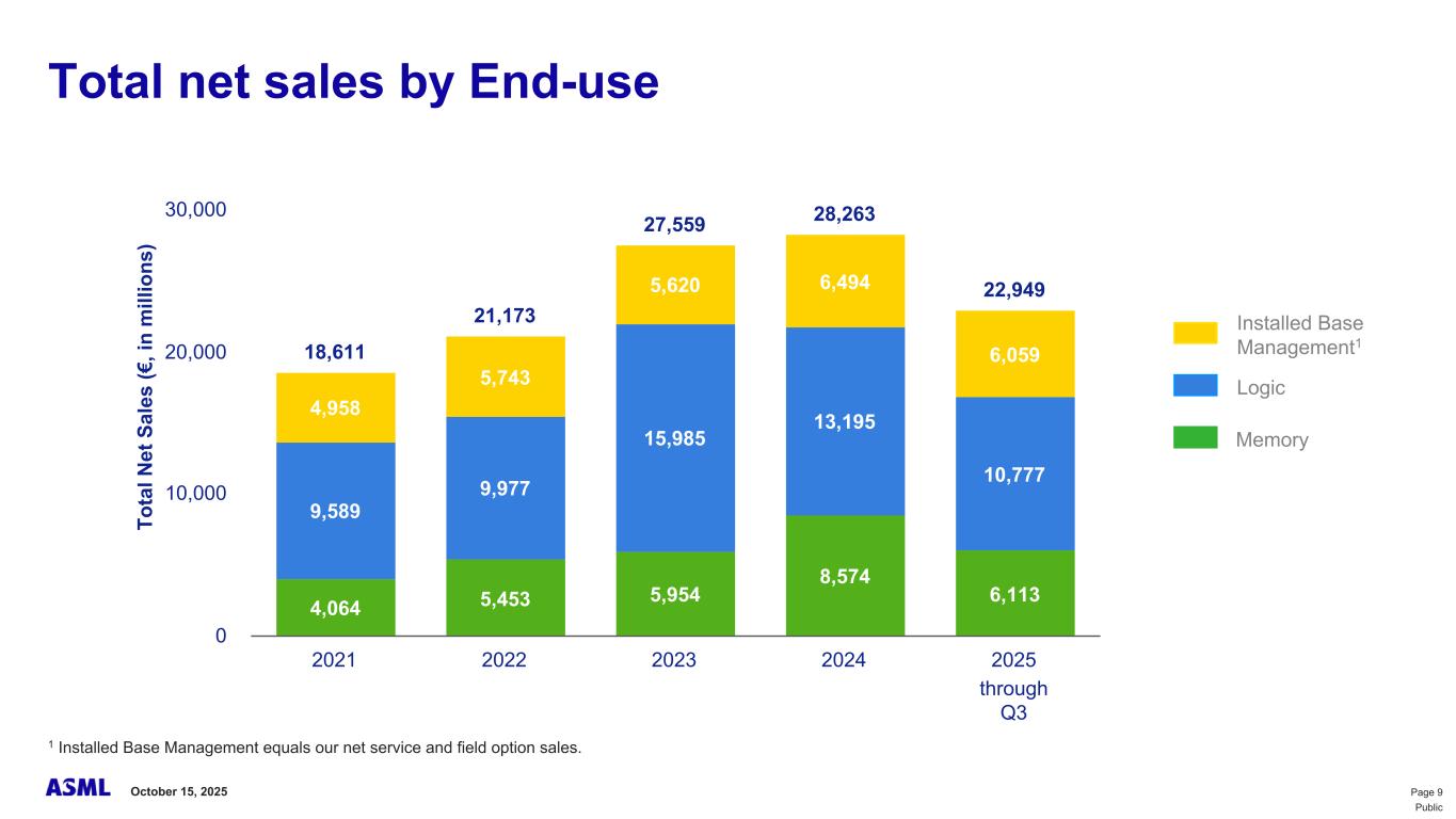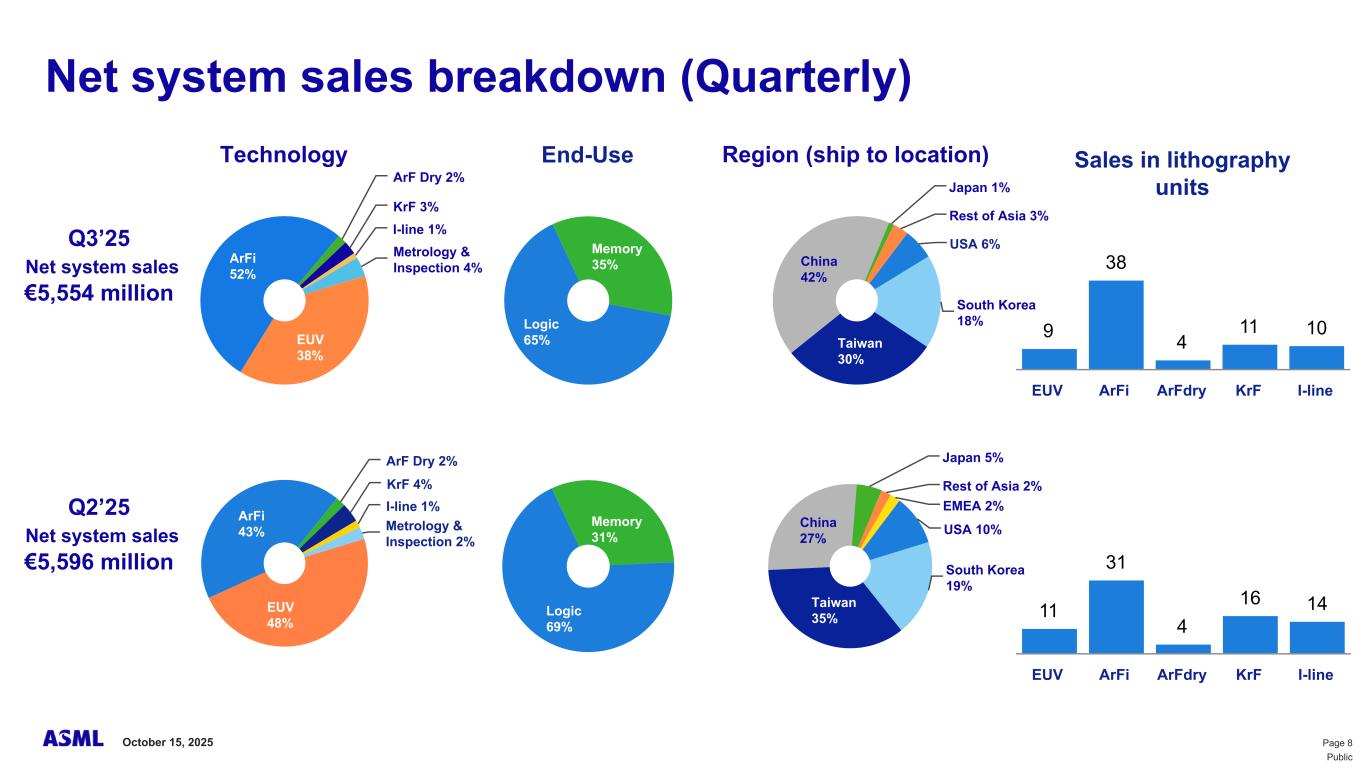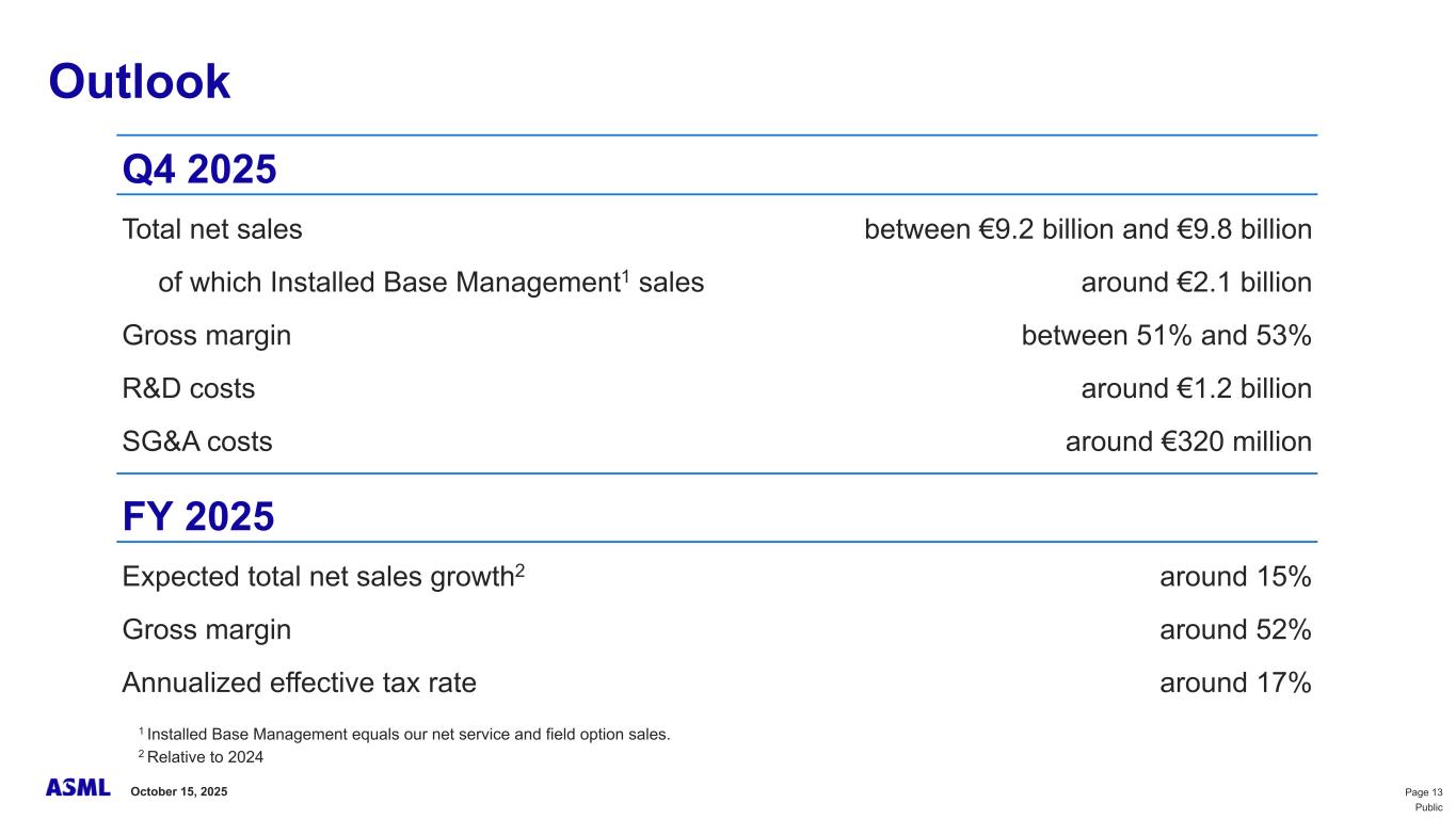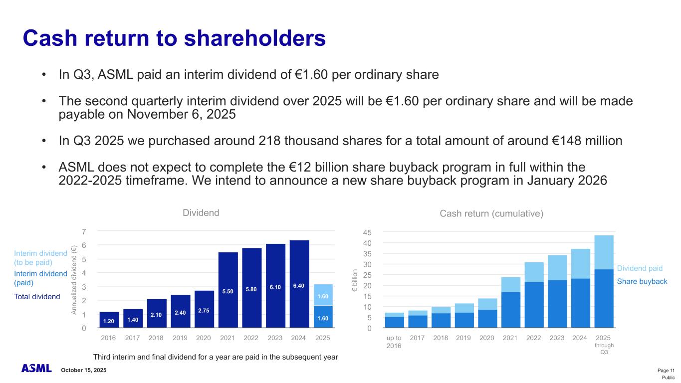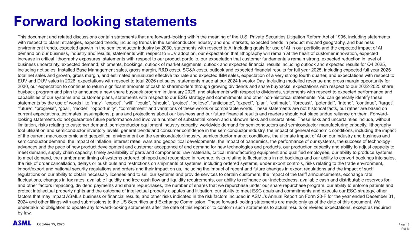 第18页2025年10月15日公开本文件和相关讨论包含1995年美国《私人证券诉讼改革法案》含义内的前瞻性陈述,包括有关计划、战略、预期趋势的陈述,包括半导体行业和终端市场的趋势、产品组合和地域的预期趋势以及商业环境趋势、到2030年半导体行业的预期增长、有关人工智能的陈述,包括在我们的投资组合中使用人工智能的目标以及人工智能需求对我们的业务、行业和结果的预期影响,有关EUV采用的陈述,我们预计光刻机仍将是客户创新的核心,预计关键光刻机曝光量将增加,关于我们产品组合的声明,我们预计客户基本面保持强劲,预计业务不确定性水平降低,预期需求、出货量、预订量、细分市场前景、前景和预期财务业绩,包括2025年第四季度的前景和预期业绩,包括净销售额、已安装基地管理销售额、毛利率、研发成本、SG & A成本、2025年全年的前景和预期财务业绩,包括预计2025年全年的总净销售额和增长、毛利率,以及估计的年化有效税率和预期IBM销售额、对第四季度非常强劲的预期、对2026年EUV和DUV销售的预期、对2026年总净销售额的预期、我们在2024年投资者日发表的声明,包括模拟2030年的收入和毛利率机会、我们对通过不断增加的股息和股票回购继续向股东返还大量现金的预期、对我们的2022-2025年股票回购计划的预期以及计划在2026年1月宣布新的股票回购计划,以及关于股息的声明,关于我们系统和客户计划的预期性能和能力的声明,关于我们的ESG战略和承诺的声明以及其他非历史性声明。你一般可以通过使用“可能”、“预期”、“将”、“可以”、“应该”、“项目”、“相信”、“预期”、“计划”、“估计”、“预测”、“潜力”、“打算”、“继续”、“目标”、“未来”、“进展”、“目标”、“模式”、“机遇”、“承诺”等词语来识别这些陈述,以及这些词语或类似词语的变体。这些陈述不是历史事实,而是基于当前对我们业务和未来财务业绩的预期、估计、假设、计划和预测,读者不应过分依赖它们。前瞻性陈述并不能保证未来的业绩,并涉及大量已知和未知的重大风险和不确定性。这些风险和不确定性包括但不限于与客户需求、半导体设备行业产能、全球对半导体和半导体制造产能的需求、光刻工具利用率和半导体库存水平、半导体行业的一般趋势和消费者信心、一般经济状况的影响,包括当前宏观经济和地缘政治环境对半导体行业的影响、半导体市场状况、人工智能对我们的行业和业务以及半导体需求的最终影响、通货膨胀、利率、战争和地缘政治发展的影响、流行病的影响、我们系统的性能,技术进步的成功和新产品开发的速度以及客户对新技术和产品的接受和需求,我们的生产能力和调整能力以满足需求,供应链能力,零部件、原材料、关键制造设备和合格员工的及时可用性,我们生产系统以满足需求的能力,订购、发货和在收入中确认的系统的数量和时间,与净预订量波动和我们将预订转化为销售的能力有关的风险,订单取消的风险,出口管制下的系统(包括已订购系统)的延迟或推出和限制发货、与贸易环境、进出口和国家安全法规和订单相关的风险及其对我们的影响,包括近期和未来出口法规变化的影响以及此类法规对我们获得必要许可证以及向某些客户销售我们的系统和提供服务的能力的影响、关税公告的影响、汇率波动、税率变化、可用流动性和自由现金流以及流动性要求、我们为债务再融资的能力,可用现金和可分配准备金,以及其他影响, 股息支付和股份回购、我们根据股份回购计划回购的股份数量、我们执行专利和保护知识产权的能力以及知识产权纠纷和诉讼的结果、我们实现ESG目标和承诺以及执行ESG战略的能力、可能影响ASML的业务或财务业绩的其他因素,以及TERMA截至2024年12月31日止年度的20-F表格年度报告以及向美国证券交易委员会提交和提交的其他文件中所载风险因素中提示的其他风险。这些前瞻性陈述仅在本文件发布之日作出。除法律要求外,我们不承担在本报告发布之日后更新任何前瞻性陈述或使此类陈述符合实际结果或经修订的预期的义务。前瞻性陈述