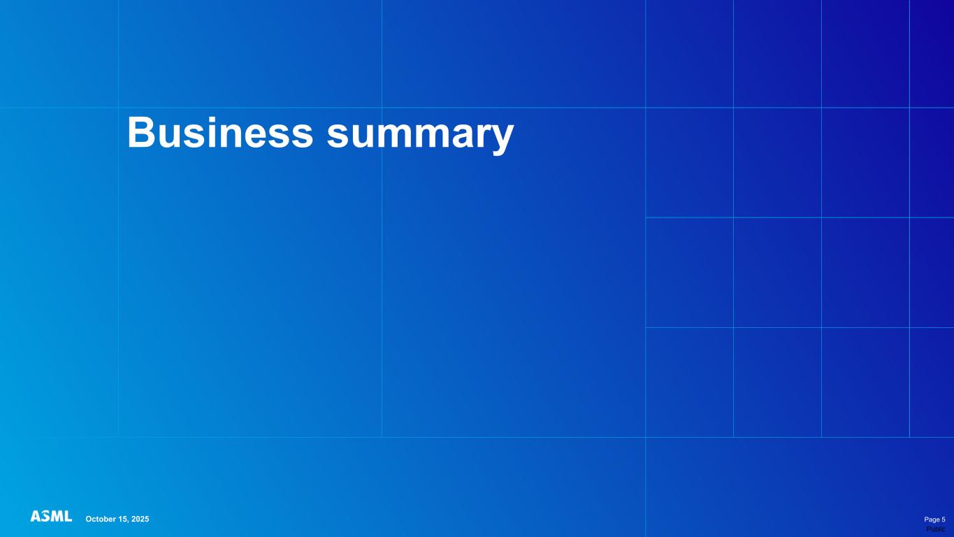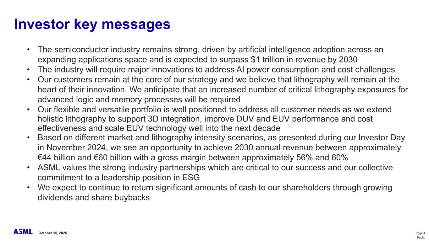第4页2025年10月15日公众投资者关键信息•半导体行业在不断扩大的应用领域采用人工智能的推动下保持强劲,预计到2030年收入将超过1万亿美元•该行业将需要重大创新来应对AI功耗和成本挑战•我们的客户仍然是我们战略的核心,我们相信光刻技术仍将是他们创新的核心。我们预计,将需要更多用于先进逻辑和内存工艺的关键光刻曝光•我们灵活且多功能的产品组合能够很好地满足所有客户需求,因为我们将整体光刻扩展到支持3D集成,提高DUV和EUV性能和成本效益,并将EUV技术很好地扩展到下一个十年•基于不同的市场和光刻强度场景,正如我们在2024年11月投资者日期间所介绍的那样,我们看到了实现2030年营收约为440亿欧元至600亿欧元、毛利率约为56%至60%之间的机会• ASML重视强大的行业合作伙伴关系,这对我们的成功以及我们对ESG领导地位的集体承诺至关重要•我们预计将通过不断增加的股息和股票回购继续向股东返还大量现金