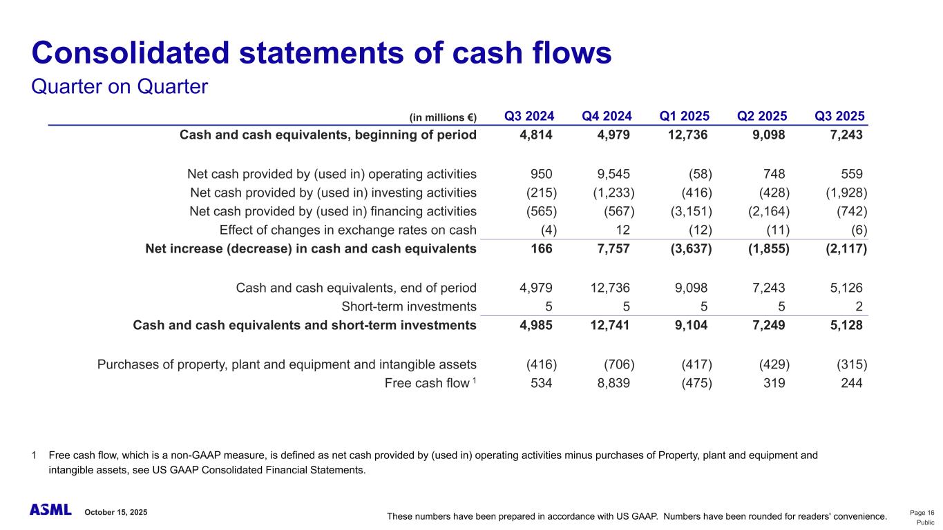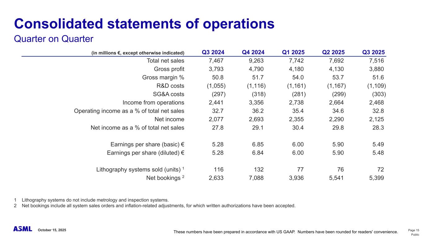 第15页2025年10月15日公开合并经营报表季度环比(百万欧元,除非另有说明)Q3 2024 Q4 2024 Q1 2025Q2 2025Q3 2025总净销售额7,4679,2637,7427,6927,516毛利润3,7934,7904,1804,1303,880毛利率% 50.85 1.75 4.05 3.75 1.6研发成本(1,055)(1,116)(1,161)(1,167)(1,109)SG & A成本(297)(318)(281)(299)(303)营业收入2,4413,3562,7382,6642,468营业收入占总净销售额的百分比32.7 36.235.43 4.63 2.8净收入2,0772,6932,3552,2902,125净收入占总净销售额的百分比27.82 9.13 0.429.8 28.3每股收益(基本)5.286.856.00 5.90 5.49每股收益(稀释后)5.286.846.00 5.90 5.48已售光刻系统(台)1116132777672净预订量22,6337,0883,9365,5415,3991光刻系统不包括计量和检测系统。2净预订量包括所有系统销售订单和通胀相关调整,已接受书面授权。这些数字是根据美国通用会计准则编制的。为方便读者阅读,数字已四舍五入。