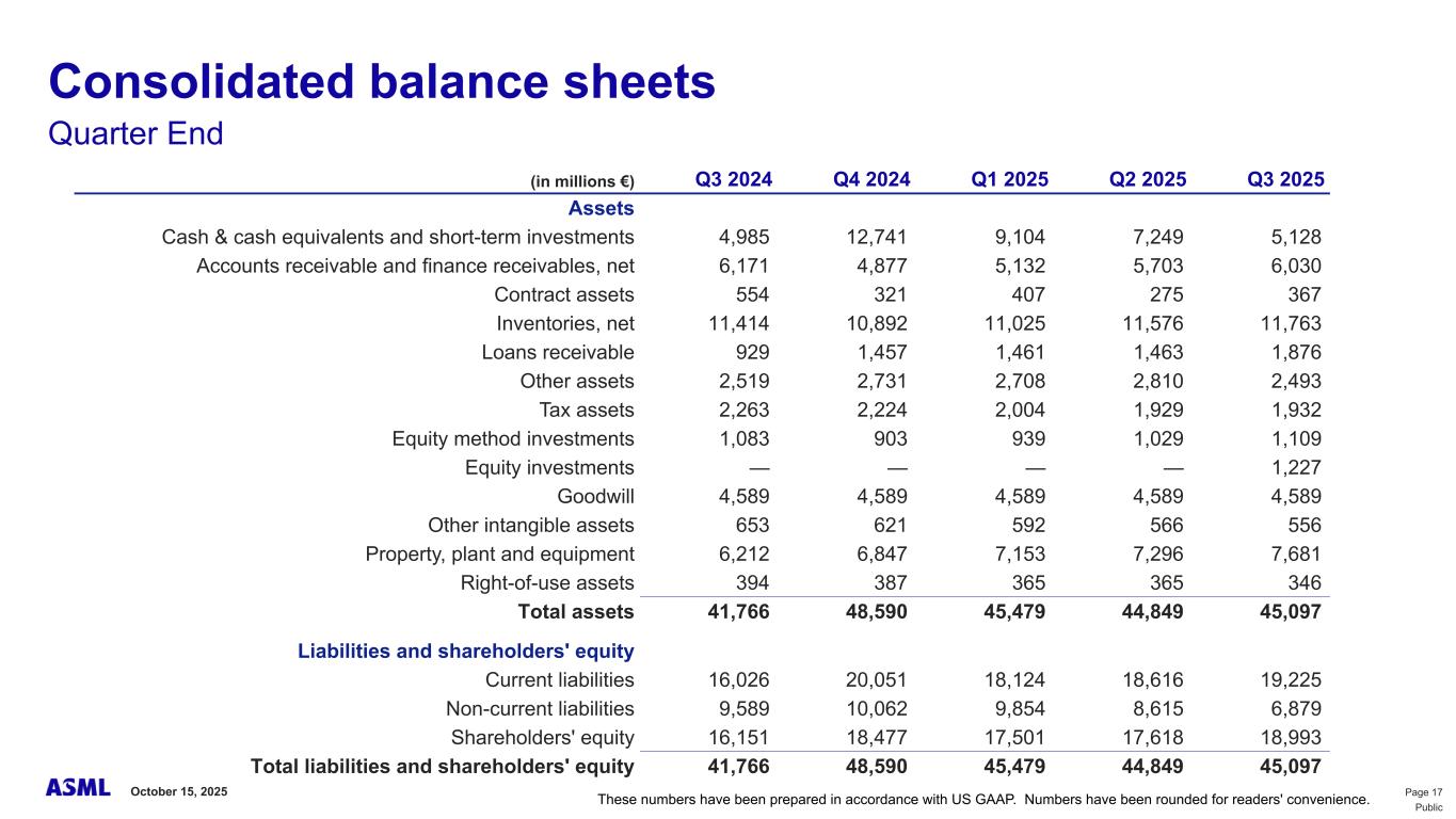 第17页2025年10月15日公开合并资产负债表季度末(百万欧元)Q3 2024 Q4 2024 Q1 2025 Q2 2025 Q3 2025资产现金及现金等价物和短期投资4,98512,7419,1047,2495,128应收账款和应收融资款净额6,1714,8775,1325,7036,030合同资产554321407275367存货,净额11,41410,89211,02511,57611,763应收贷款9291,4571,4611,4631,876其他资产2,5192,7312,7082,8102,493税收资产2,2632,2242,0041,9291,932权益法投资1,0839039391,0291,109股权投资———— 1,227商誉4,5894,5894,5894,589其他无形资产653621592566556财产,厂房和设备6,2126,8477,1537,2967,681使用权资产394387365365346总资产41,76648,59045,47944,84945,097负债和股东权益流动负债16,02620,05118,12418,61619,225非流动负债9,58910,0629,8548,6156,879股东权益16,15118,47717,50117,61818,993总负债和股东权益41,76648,59045,47944,84945,097这些数字是按照美国公认会计原则编制的。为方便读者阅读,数字已四舍五入。