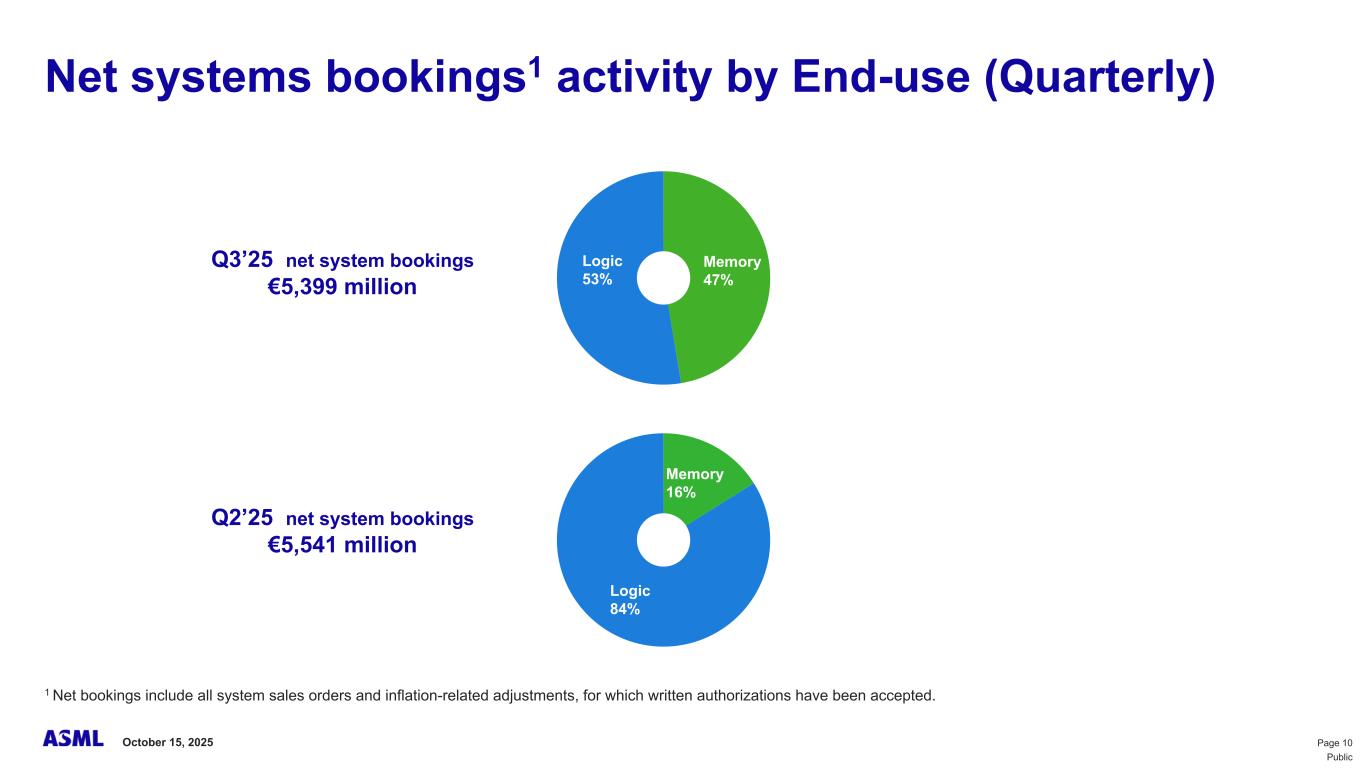 第10页2025年10月15日公共网络系统预订1活动按最终用途(季度)Q3’25净系统预订53.99亿欧元Q2’25净系统预订55.41亿欧元内存16%逻辑84% 1净预订包括所有系统销售订单和与通货膨胀相关的调整,已接受书面授权。内存47%逻辑53%