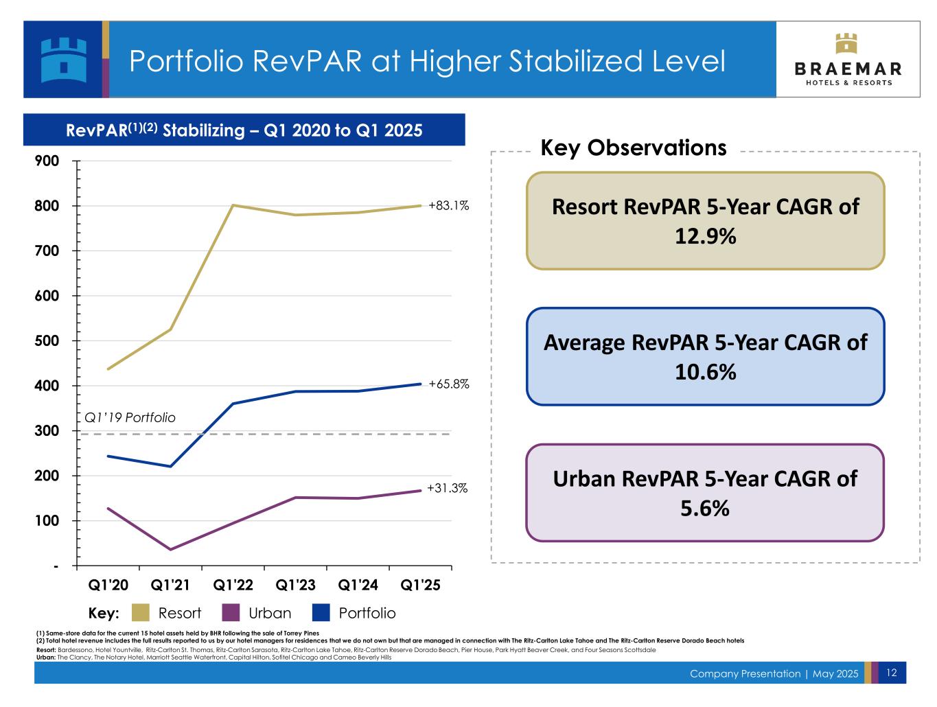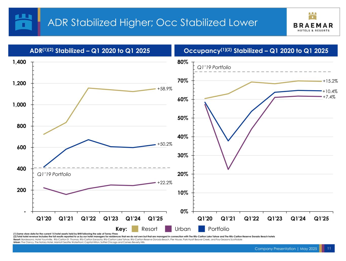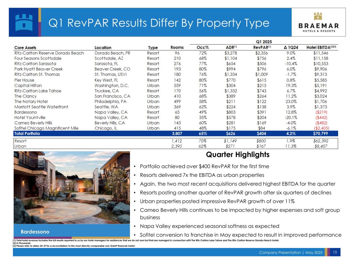 公司介绍| 2025年5月15日Q1 RevPAR结果按物业类型不同Bardessono季度亮点(1)酒店总收入包括我们的酒店经理向我们报告的关于我们不拥有但与Ritz-Carlton Lake Tahoe和Ritz-Carlton Reserve Dorado Beach酒店相关管理的住宅的全部结果(2)(以千为单位)(3)请参阅幻灯片24-37,了解与最直接可比的非GAAP财务指标的对账•投资组合首次实现超过400美元的RevPAR •度假村交付的EBITDA是城市物业的7倍•再次,最近的两项收购实现了本季度最高的EBITDA •度假村在经历了六个季度的下滑后,RevPAR又增长了一个季度•城市物业的RevPAR增长超过11%,令人印象深刻• Cameo Beverly Hills继续受到费用增加和集团业务疲软的影响•纳帕谷如预期经历了季节性疲软•预计5月份索菲特酒店转为特许经营将带来业绩改善