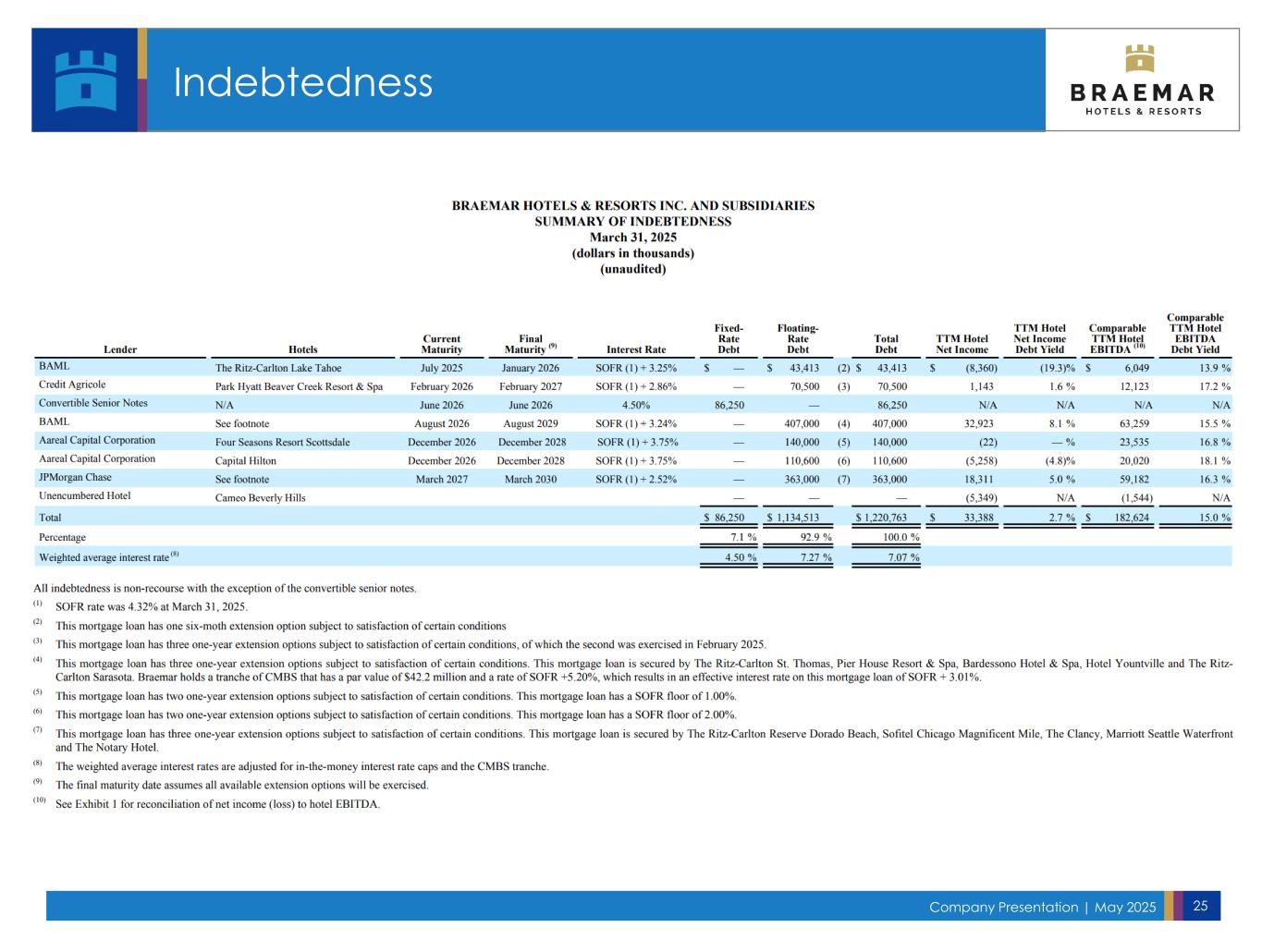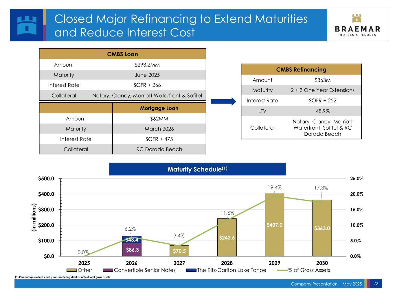 公司介绍| 2025年5月22日结束重大再融资以延长期限并降低利息成本CMBS贷款金额$ 293.2mm到期2025年6月利率SOFR + 266 Collateral Notary,Clancy,万豪酒店 Waterfront & Sofitel CMBS再融资金额$ 3.63亿到期2 + 3一年延期利率SOFR + 252 LTV48.9 % Collateral Notary,Clancy,TERM3 Waterfront,Sofitel & RC Dorado Beach抵押贷款金额$ 62mm到期2026年3月利率SOFR + 475抵押品RC Dorado Beach到期时间表(1)(1)百分比反映每年到期债务占总资产的百分比$ 70.5 $ 242.6 $ 407.0 $ 363.0 $ 86.3 $ 43.4 0.0% 6.2% 3.4% 11.6% 19.4% 17.3% 0.0% 5.0% 10.0% 15.0% 20.0% 25.0% $ 0.0 $ 100.0 $ 200.0 $ 300.0 $ 400.0 $ 500.0 202520262027202820292030(in m ill io ns)其他可转换优先票据The Ritz-Carlton Lake Tahoe % of Gross Assets