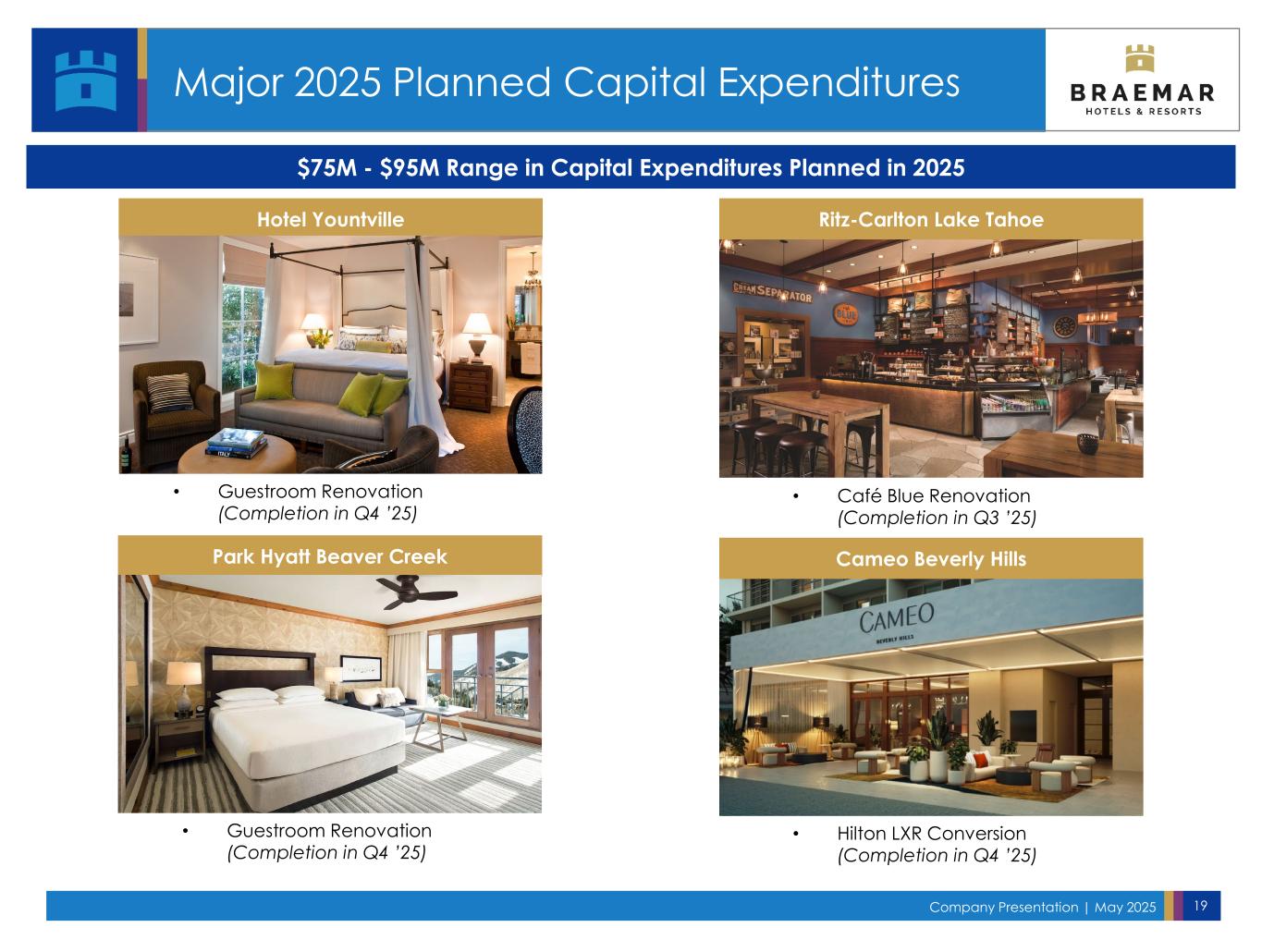 公司介绍| 2025年5月19项主要2025年计划资本支出Ritz-Carlton Lake Tahoe Park Hyatt Beaver Creek Hotel Yountville Cameo Beverly Hills 2025年计划资本支出7500万美元-9500万美元范围• Caf é Blue改造(25年Q3完成)•客房改造(25年Q4完成)•希尔顿LXR改造(25年Q4完成)•客房改造(25年Q4完成)