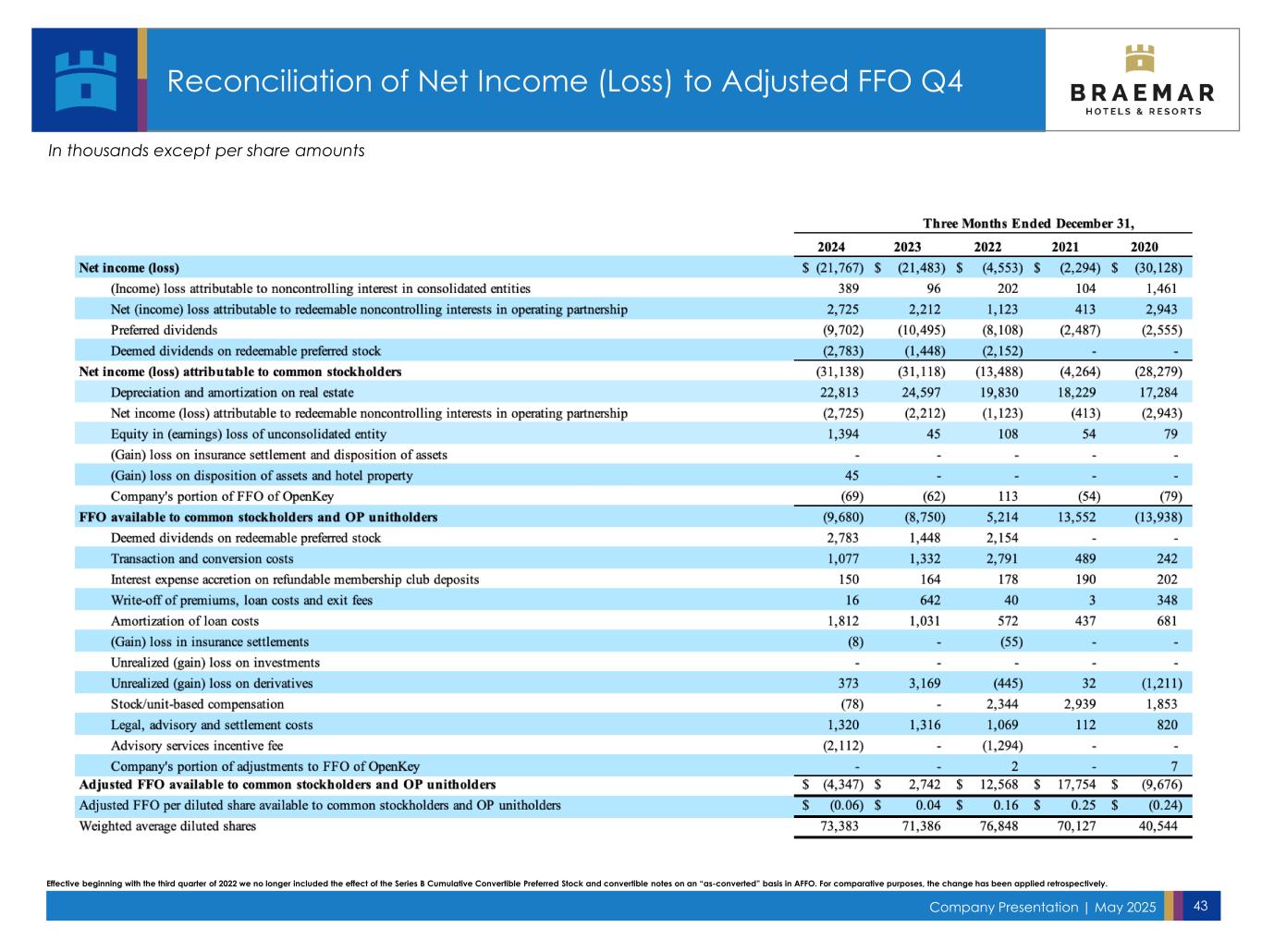公司介绍| 2025年5月43净收入(亏损)与调整后FFO Q4的对账(以千为单位,每股金额除外)自2022年第三季度开始生效,我们不再将B系列累积可转换优先股和可转换票据的影响纳入AFFO的“转换后”基础上。为便于比较,该变更已追溯适用。