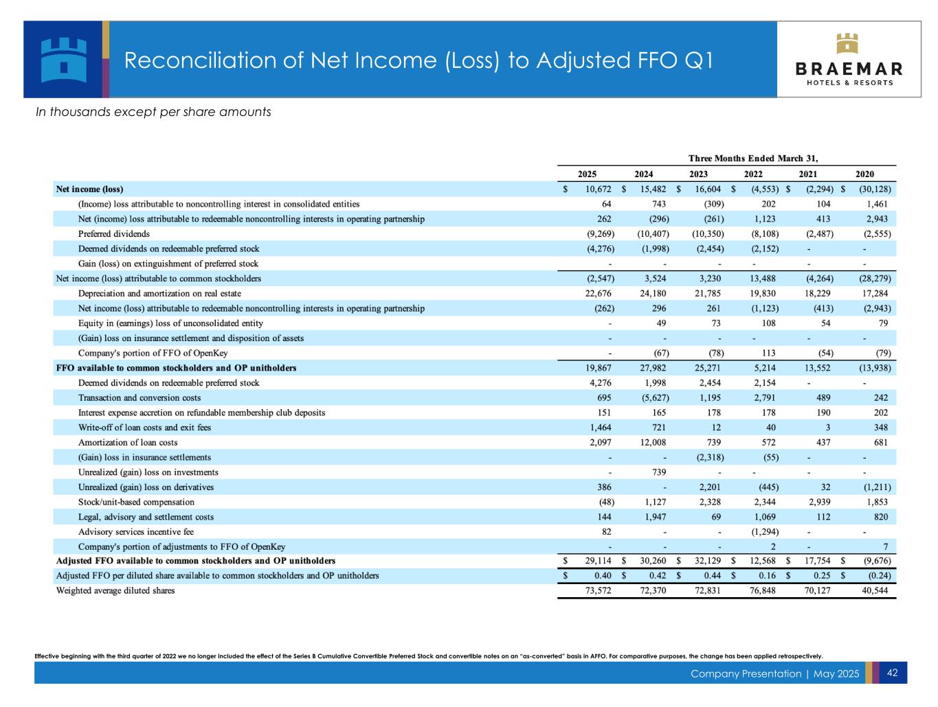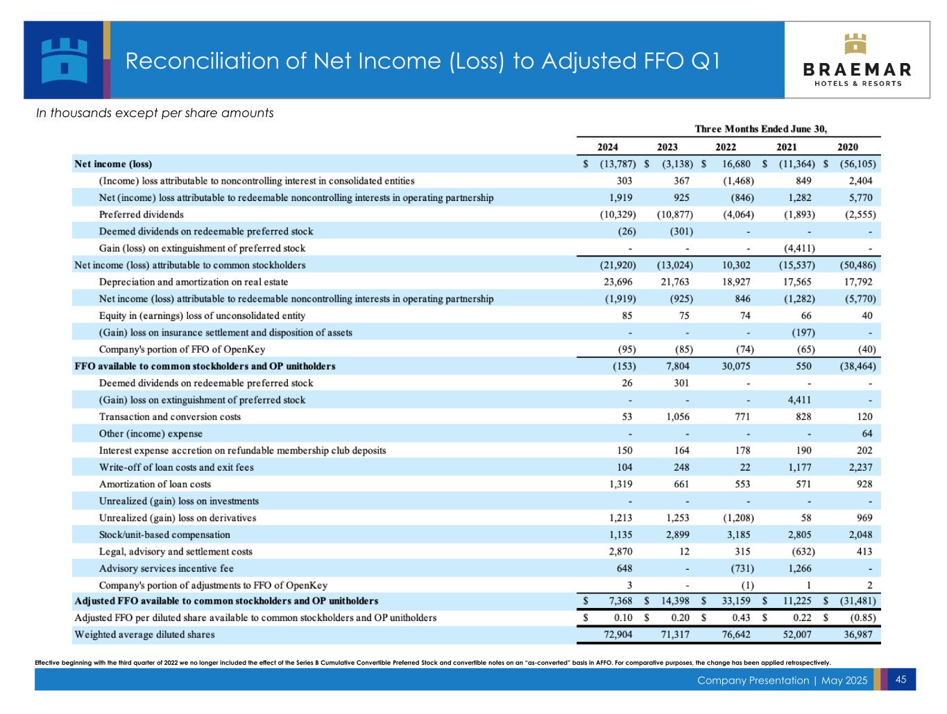 公司介绍| 2025年5月42净收入(亏损)与调整后FFO Q1的对账(以千为单位,每股金额除外)自2022年第三季度开始生效,我们不再将B系列累积可转换优先股和可转换票据的影响纳入AFFO的“转换后”基础上。为便于比较,该变更已追溯适用。