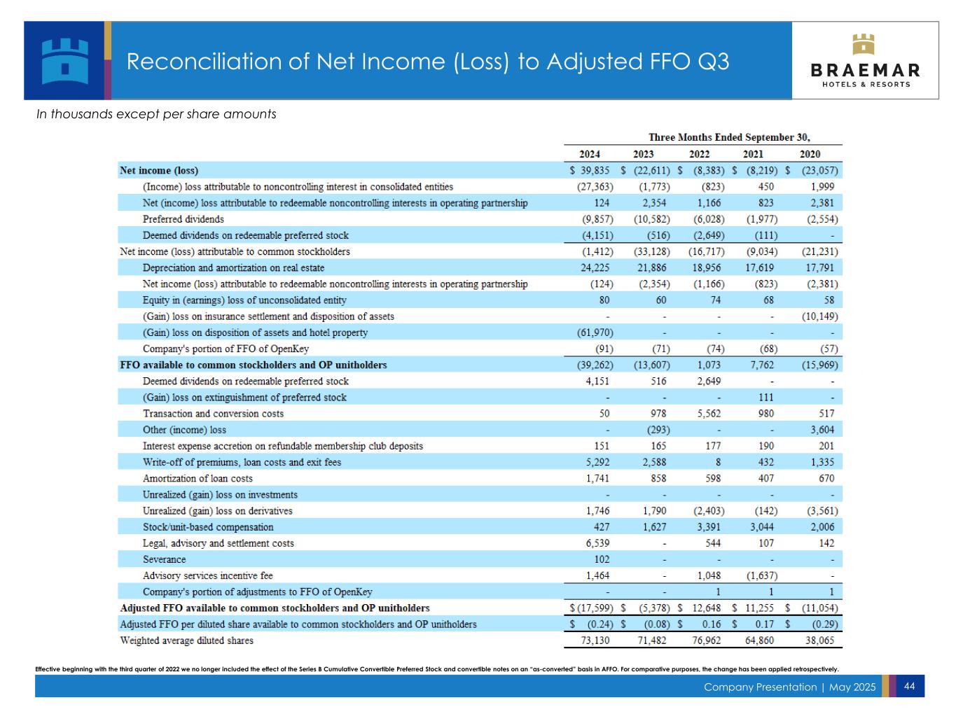 公司介绍| 2025年5月44净收入(亏损)与调整后FFO Q3的对账(以千为单位,每股金额除外)自2022年第三季度开始生效,我们不再将B系列累积可转换优先股和可转换票据的影响纳入AFFO的“转换后”基础上。为便于比较,该变更已追溯适用。
