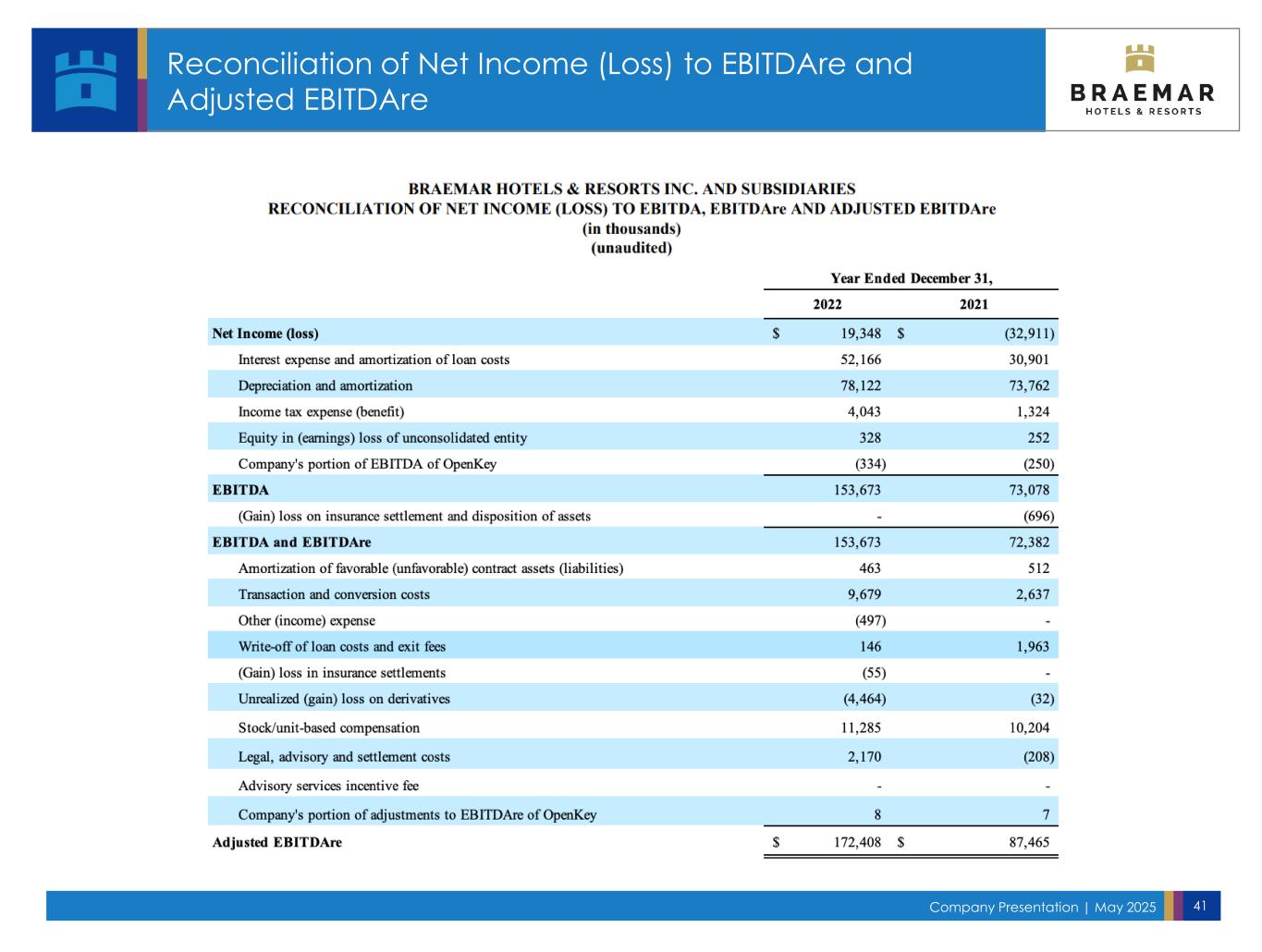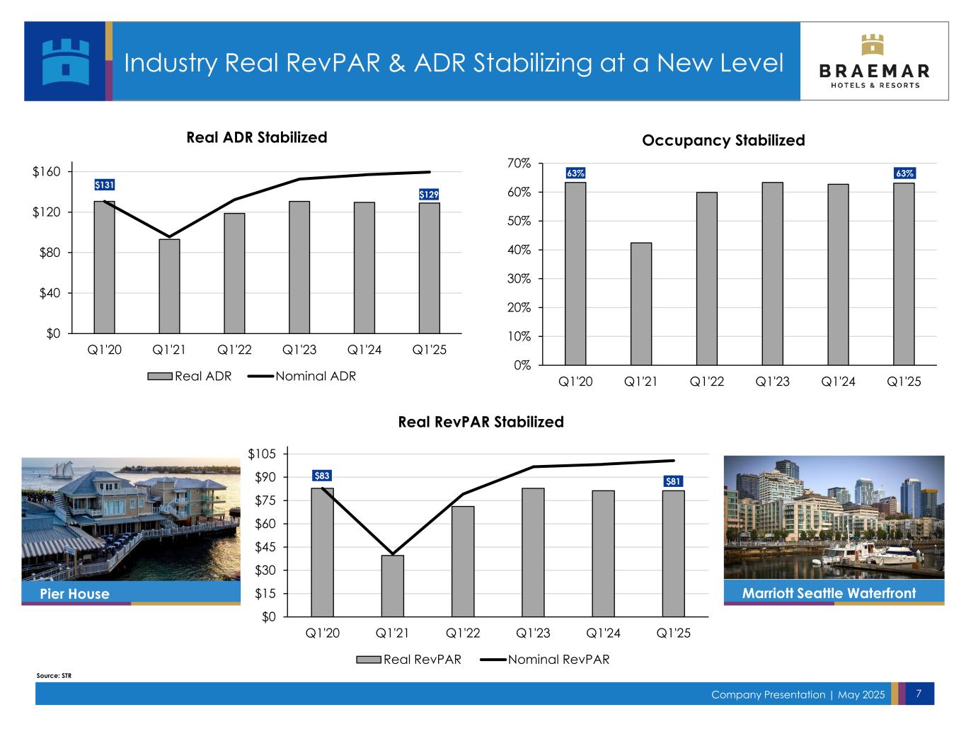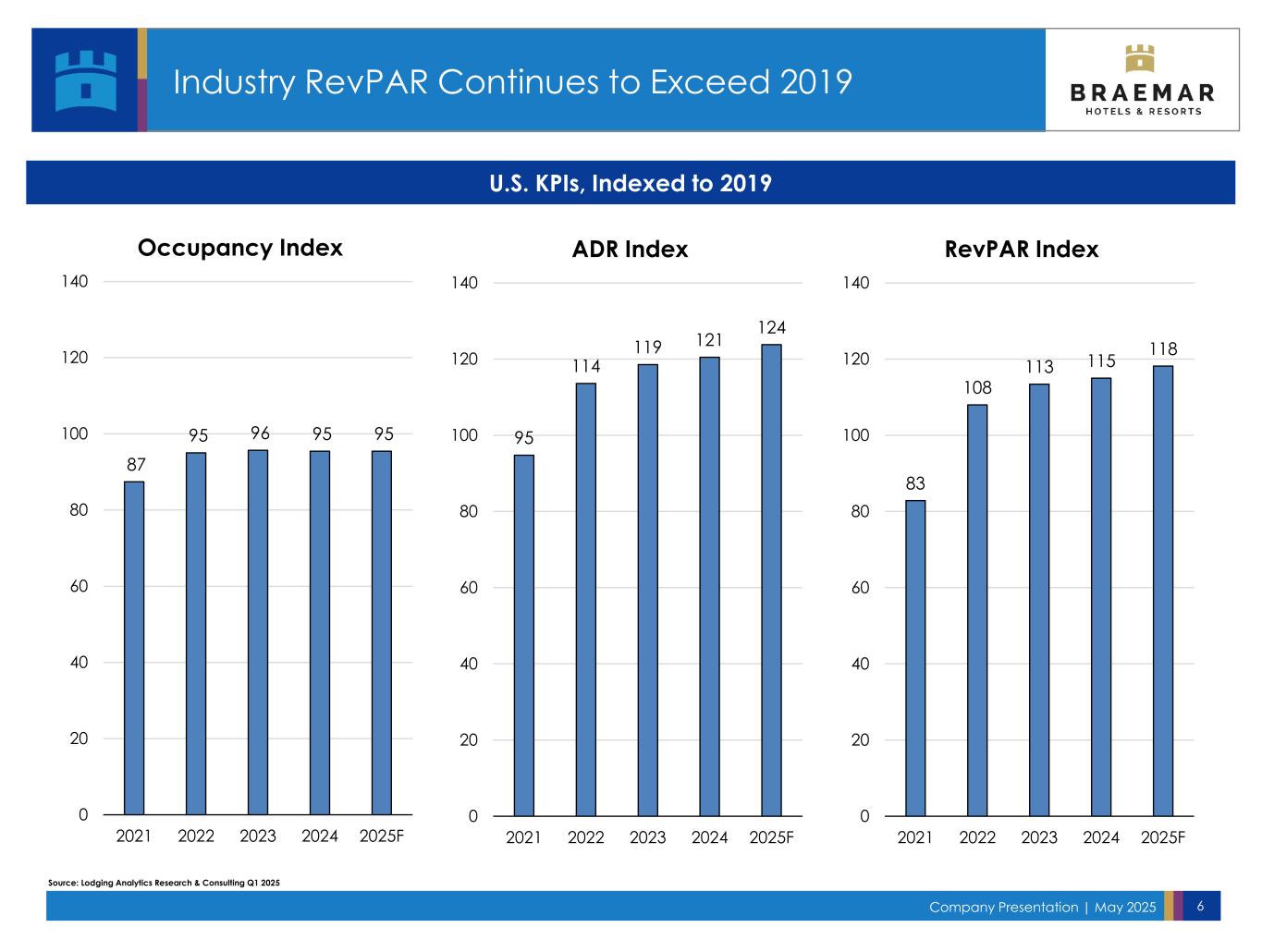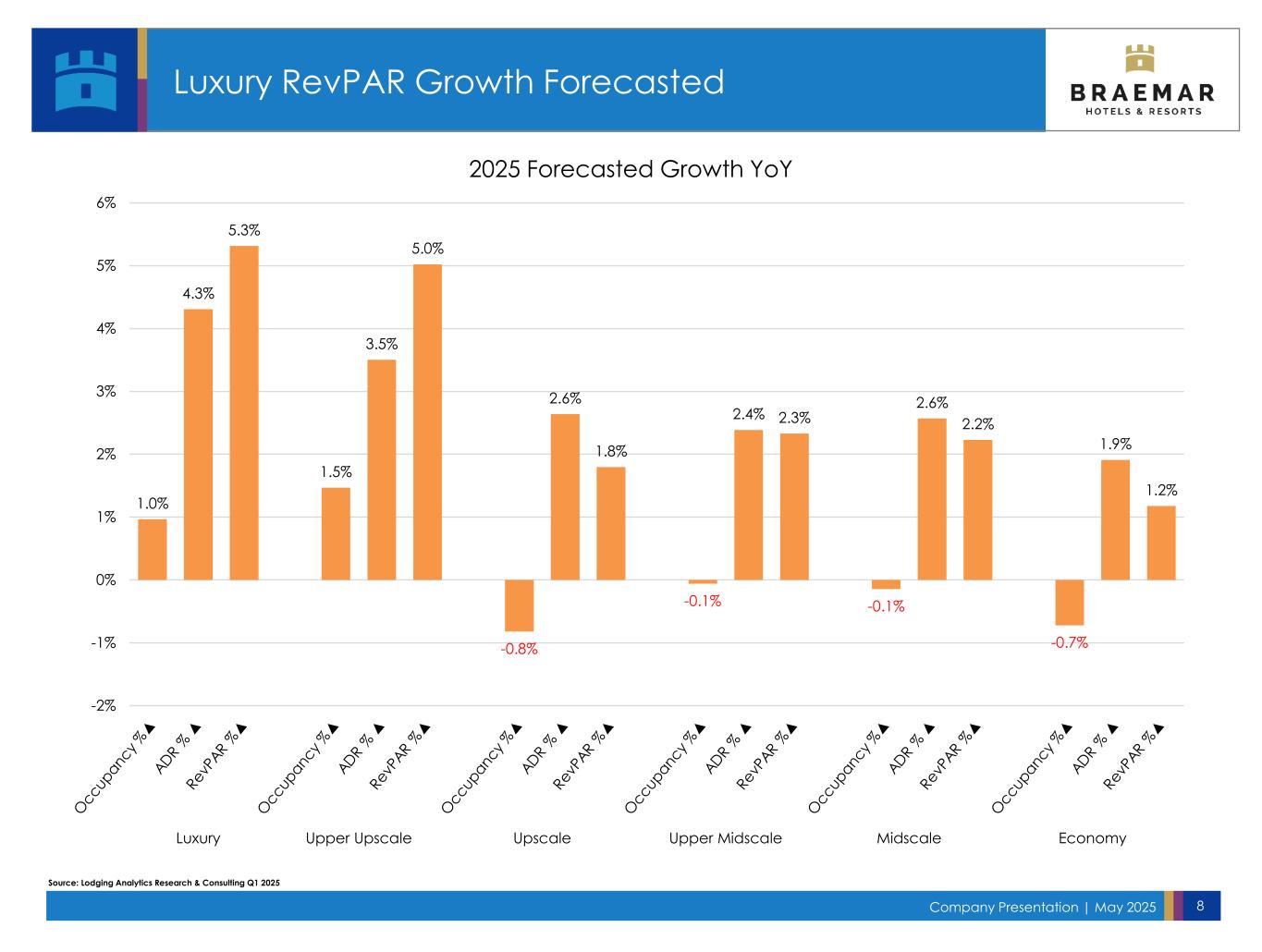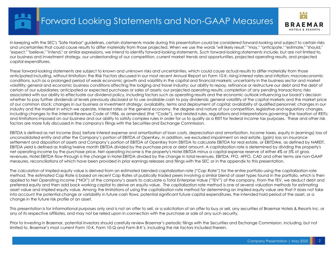 公司介绍| 2025年5月2前瞻性陈述和非GAAP措施符合SEC的“安全港”准则,本次介绍中所做的某些陈述可能被视为前瞻性陈述,并受到某些风险和不确定性的影响,可能导致结果与预测结果存在重大差异。当我们使用“将可能导致”、“可能”、“预期”、“估计”、“应该”、“预期”、“相信”、“打算”或类似表述时,我们打算识别前瞻性陈述。这些前瞻性陈述包括但不限于我们的业务和投资战略、我们对竞争的理解、当前的市场趋势和机会、预计的经营业绩以及预计的资本支出。这些前瞻性陈述受已知和未知风险和不确定性的影响,可能导致实际结果与预期存在重大差异,包括但不限于:我们在最近的10-K表格年度报告中讨论的风险因素;利率上升和通货膨胀;宏观经济状况,例如长期疲软的经济增长以及资本和金融市场的波动;商业部门的不确定性和市场波动;影响住宿和旅行行业的一般和经济商业状况;我们的偿还能力,为我们的债务和我们某些子公司的债务进行再融资或重组;预期或预期购买或出售资产;我们预计的经营业绩;完成任何未决交易;与我们执行股息政策的能力相关的风险,包括影响我们董事会决定是否按先前披露的水平进一步支付股息或使用可用现金支付股息的因素,例如经营业绩和经济前景;资本市场的普遍波动和我们普通股的市场价格;我们的业务或投资策略的变化;可用性,资本的条款和部署;合格人员的可用性;我们的行业和我们经营所在的市场的变化、利率或总体经济、我们的竞争程度和性质、立法和监管变化,包括对经修订的1986年《国内税收法典》(“法典”)以及有关REITs税收的相关规则、条例和解释的变化;以及对我们的业务和我们满足复杂规则的能力施加的限制,以便我们有资格成为联邦所得税目的的REIT。这些和其他风险因素在该公司提交给美国证券交易委员会的文件中得到了更充分的讨论。EBITDA定义为扣除利息支出和贷款成本摊销、折旧和摊销、所得税、未合并实体的权益(收益)损失以及OpenKey的公司部分EBITDA后的净收入(亏损)。此外,我们从EBITDA中排除了房地产减值、保险结算和资产处置的(收益)损失以及OpenKey的公司部分EBITDA,以计算NAREIT定义的房地产EBITDA或EBITDA。EBITDA收益率定义为过去12个月的EBITDA除以购买价格或债务金额。资本化率由物业净营业收入除以购买价款确定。净营业收入是该物业的酒店EBITDA减去占总收入4%或5%的资本支出准备金。酒店EBITDA流转值是酒店EBITDA的变化除以总收入的变化。EBITDA、FFO、AFFO、CAD和其他条款属于非公认会计原则措施,其调节已在先前的收益发布和提交给SEC的文件中或在本演示文稿的附录中提供。隐含股权价值的计算是通过使用资本化率法对整个投资组合进行估计的混合资本化率(“Cap Rate”)得出的。估计的上限率是基于涉及投资组合中发现的类似资产类型混合的公开交易同行的近期上限率,然后将其应用于公司资产的净营业收入(“NOI”),以计算公司的总企业价值(“TEV”)。从TEV中,我们扣除债务和优先股权,然后加回营运资本,得出股权价值。资本化率法是估算资产价值和隐含权益价值的几种估值方法之一。使用资本化率法确定隐含股权价值的局限性包括:未考虑未来现金流的潜在变化或可变性、潜在的重大未来资本支出、资产的预期持有期或资产未来风险状况的变化。本演示文稿仅供参考,不是出售要约,也不是买卖要约的招揽, Braemar酒店及度假村公司或其任何关联公司的任何证券,并且不得在购买或出售任何此类证券时依赖。在投资Braemar之前,潜在投资者应仔细查看Braemar定期向美国证券交易委员会提交的文件,包括但不限于Braemar最新的10-K表格、10-Q表格和8-K表格,包括其中包含的风险因素。