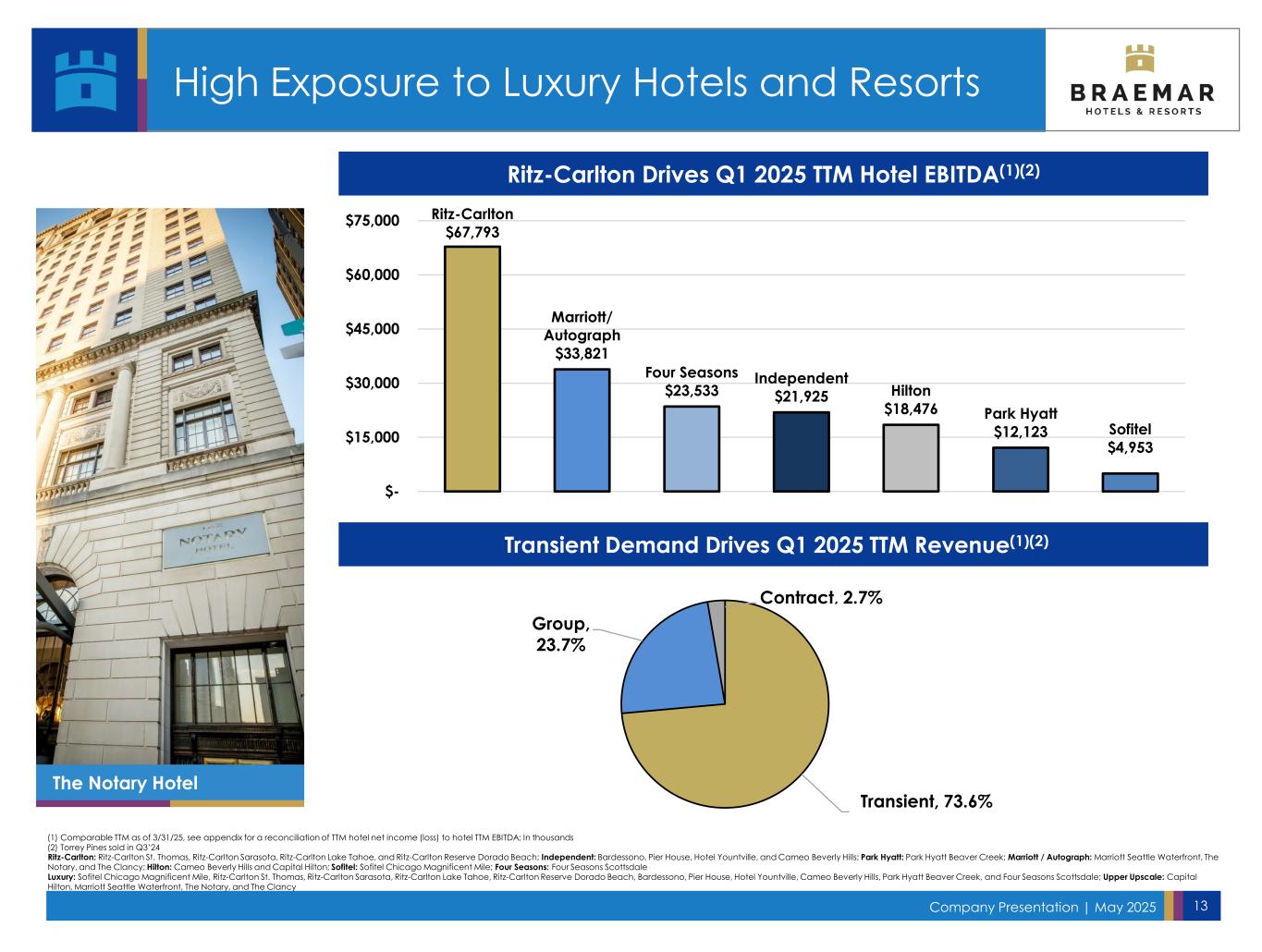 公司介绍| 2025年5月13日丽思卡尔顿推动2025年第一季度TTM酒店EBITDA(1)(2)(1)截至3/31/25的可比TTM,TTM酒店净收入(亏损)与酒店TTM EBITDA的对账见附录;以千为单位(2)24年第三季度售出的Torrey Pines瞬态需求推动2025年第一季度TTM收入(1)(2)对豪华酒店和度假村Ritz-Carlton的高曝光率:Ritz-Carlton St. Thomas、Ritz-Carlton Sarasota、Ritz-Carlton Lake Tahoe、Ritz-Carlton Reserve Dorado Beach;独立:Bardessono、Pier House、Hotel Yountville、Cameo Beverly Hills;和克兰西;希尔顿:Cameo Beverly Hills和Capital Hilton;Sofitel:Sofitel Chicago Magnificent Mile;Four Seasons:Four Seasons Scottsdale Luxury:Sofitel Chicago Magnificent Mile,Ritz-Carlton St. Thomas,Ritz-Carlton Sarasota,Ritz-Carlton Lake Tahoe,Ritz-Carlton Reserve Dorado Beach,Bardessono,Pier House,Hotel Yountville,Cameo Beverly Hills,Park Hyatt Beaver Creek,and Four Seasons Scottsdale;Upper Upscale:Capital Hilton,万豪酒店 Seattle Waterfront,the Notary,and the Clancy the Notary Hotel Ritz-Carlton $ 67,