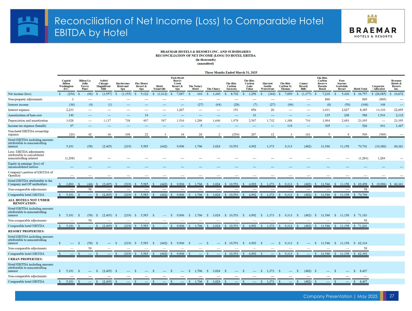 公司介绍| 2025年5月27日按酒店划分的净收入(亏损)与可比酒店EBITDA的调节