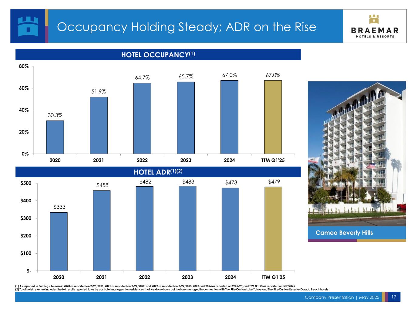公司介绍| 2025年5月17(1)如收益发布中所报告:2020为2021年2月25日所报告;2021为2022年2月24日所报告;2022为2023年2月22日所报告;2023和2024年为2/26/25所报告;而TTM Q1’25为2025年5月7日所报告(2)酒店总收入包括我们的酒店经理向我们报告的关于我们不拥有的住宅的全部结果,但与Ritz-Carlton Lake Tahoe和Ritz-Carlton Reserve Dorado Beach酒店相关管理的酒店ADR(1)(2)酒店入住率(1)入住率保持稳定;ADR上涨30.3% 51.9% 64.7% 65.7% 67.0% 67.0% 20% 40% 60% 80% 20202021202220232024 TTM Q1‘25 $ 333 $ 458 $ 482 $ 483 $ 473 $ 479 $-$ 100 $ 200 $ 300 $ 400 $ 50020202021202220232024 TTM Q1’25 Cameo Beverly Hills