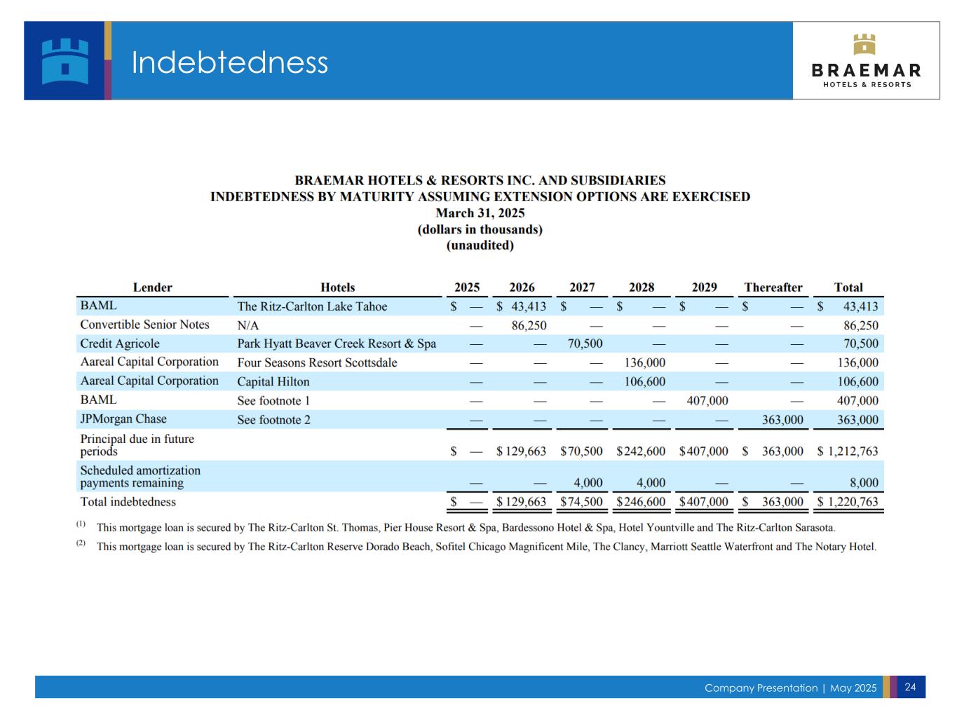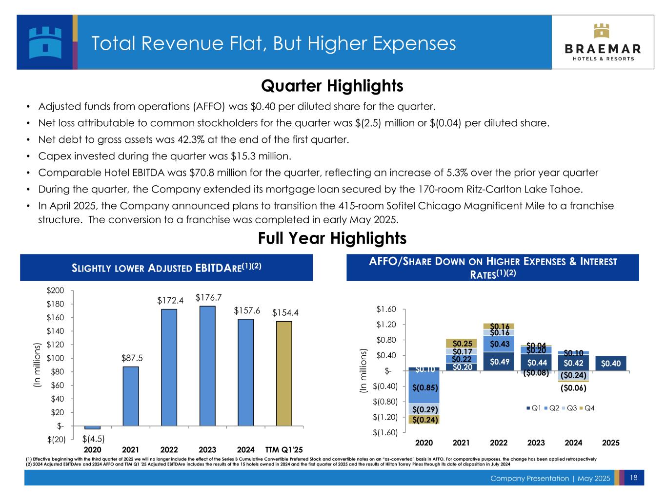公司介绍| 2025年5月18日AFFO/股因支出增加和利率下降(1)(2)调整后EBITDA略低(1)(2)季度亮点全年亮点总收入持平,但费用增加(1)自2022年第三季度开始,我们将不再将B系列累积可转换优先股和可转换票据的影响纳入AFFO中的“按转换后”基准。出于比较目的,该变更已追溯应用(2)2024年调整后EBITDA和2024年AFFO及TTM Q1'25调整后EBITDA包括2024年和2025年第一季度拥有的15家酒店的业绩以及Hilton Torrey Pines截至2024年7月处置日期的业绩$(4.5)$ 87.5 $ 172.4 $ 176.7 $ 157.6 $ 154.4 $(20)$-$ 20 $ 40 $ 60 $ 80 $ 100 $ 120 $ 140 $ 160 $ 180 $ 20020202021202220232024 TTM Q1'25(in m illi on s)$ 0.10 $ 0.20 $ 0.49 $ 0.44 $ 0.42 $ 0.40 $(0.85)$ 0.22 $ 0.43 $ 0.43 $ 0.20 $ 0.10 $(0.29)$ 0.17 $ 0.16($ 0.08)($ 0.24)$(0.24)$ 0.25 $ 0.16 $ 0.04($ 0.06)$(1.60)$(1.20)$(0.80)$-$ 0.40 $ 0.80 $ 1.20 $ 1.60 202020212022202320242025(in m illi on本季度的份额。•本季度归属于普通股股东的净亏损为(2.5)百万美元或每股摊薄收益(0.04)美元。•第一季度末净债务与总资产之比为42.3%。•本季度投入的资本支出为1530万美元。•本季度可比酒店EBITDA为7080万美元,比去年同期增长5.3% •在本季度,公司延长了由170间客房的Ritz-Carlton Lake Tahoe提供担保的抵押贷款。• 2025年4月,公司宣布计划将拥有415间客房的芝加哥壮丽大道索菲特酒店过渡到特许经营结构。转换为特许经营权已于2025年5月初完成。