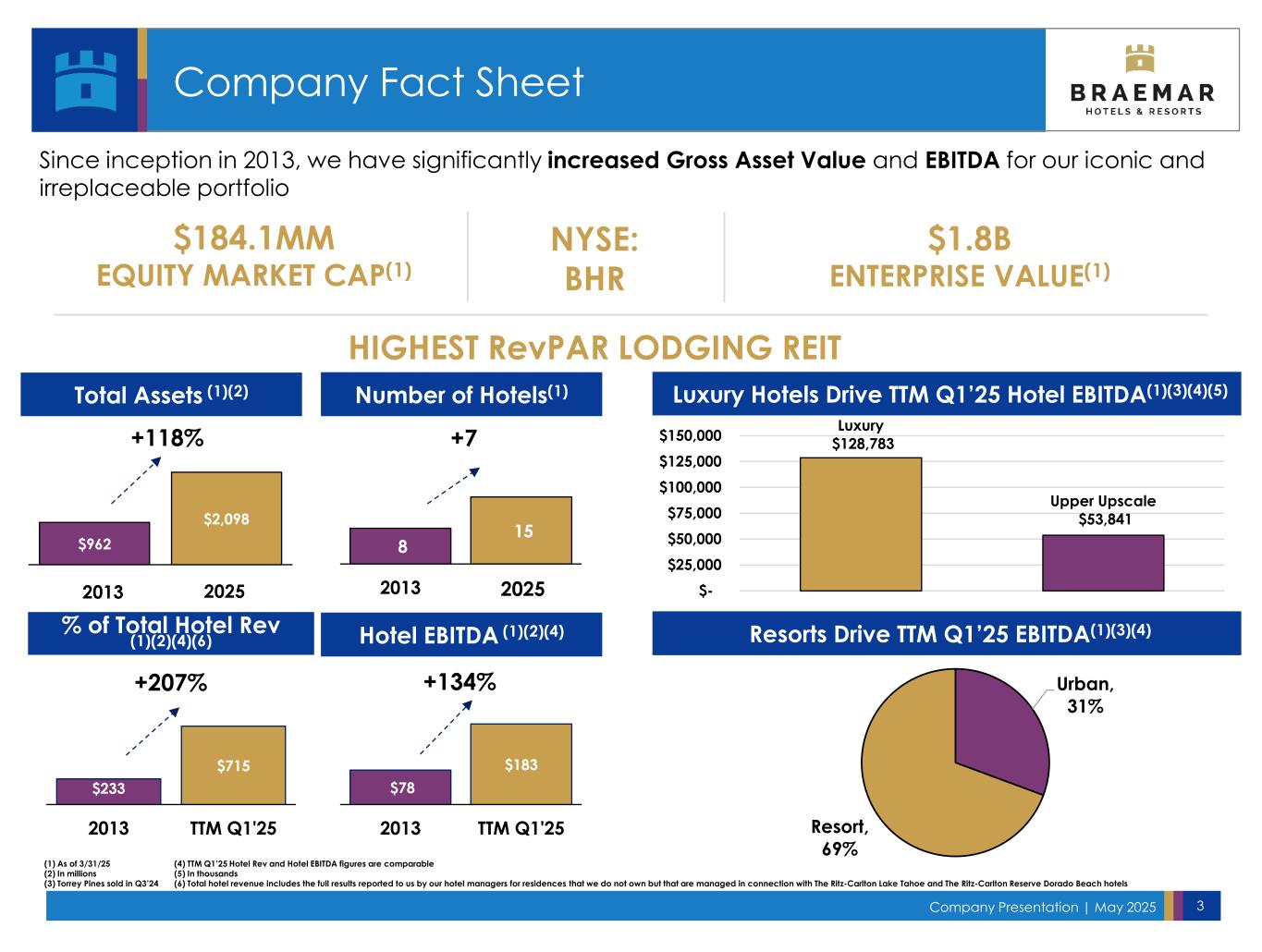公司介绍| 2025年5月3 $ 233 $ 7152013 TTM Q1'25 + 207% $ 962 $ 2,09812/31/20133/31/2025 + 118% Urban,31% Resort,69% 81520132024 + 7总资产(1)(2)酒店EBITDA(1)(2)(4)(1)截至3/31/25(2)百万(3)Torrey Pines于24年Q3售出酒店数量(1)占酒店总数的百分比Rev(1)(2)(4)(6)公司概况介绍自2013年成立以来,我们已显着提高了我们标志性且不可替代的投资组合的总资产价值和EBITDA NYSE:BHR $ 184.1mm Equity Market CAP(1)$ 1.8B enterprise value(1)Highest RevAR LODGING REIT 20135 Luxury Hotels Drive TTMQ1’25酒店EBITDA(1)(3)(4)(5)Resorts Drive TTMQ1’25 EBITDA(1)(3)(4)(4)TTM Q1’25酒店Rev和酒店EBITDA数据具有可比性(5),单位为千(6)酒店总收入包括我们的酒店经理向我们报告的关于我们不拥有但与Ritz-Carlton Lake Tahoe和Ritz-Carlton Reserve Dorado Beach酒店相关的管理费用2025 $ 78 $ 183 2013 TTM Q1'25 + 134%豪华$ 128,783 Upper Upscale $ 53,841 $-$ 25,000 $ 50,000 $ 75,000 $ 100,000 $ 125,000 $ 150,000