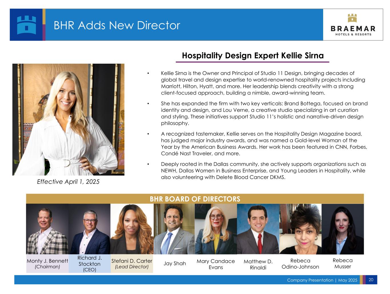 公司介绍| 2025年5月20日BHR增设新董事Jay Shah Mary丨坎迪斯·埃文斯Candace Evans Rebeca Odino-Johnson Matthew D. RinaldiRichard J. Stockton(首席执行官)BHR董事会Stefani D. Carter(首席董事)TERM5(主席)酒店设计专家Kellie Sirna • Kellie Sirna是Studio 11 Design的所有者和负责人,为包括万豪酒店、希尔顿、凯悦等世界知名酒店项目带来数十年的全球旅行和设计专长。她的领导力将创造力与强大的以客户为中心的方法融为一体,建立了一支灵活、屡获殊荣的团队。•她通过两个关键垂直领域扩大了公司:品牌Bottega,专注于品牌标识和设计,以及Lou Verne,一家专门从事艺术策划和造型的创意工作室。这些举措支持Studio 11的整体和叙事驱动的设计理念。•作为公认的品味制造者,凯莉在《好客设计》杂志董事会任职,曾评出各大行业奖项,并被美国商业奖评为年度金级女性。她的作品被CNN、《福布斯》、《康泰纳仕旅行者》等报道。•她深深扎根于达拉斯社区,积极支持NEWH、Dallas Women in Business Enterprise、Young Leaders in Hospitality等组织,同时也为删除血癌DKMS做志愿者。Rebeca Musser 2025年4月1日生效