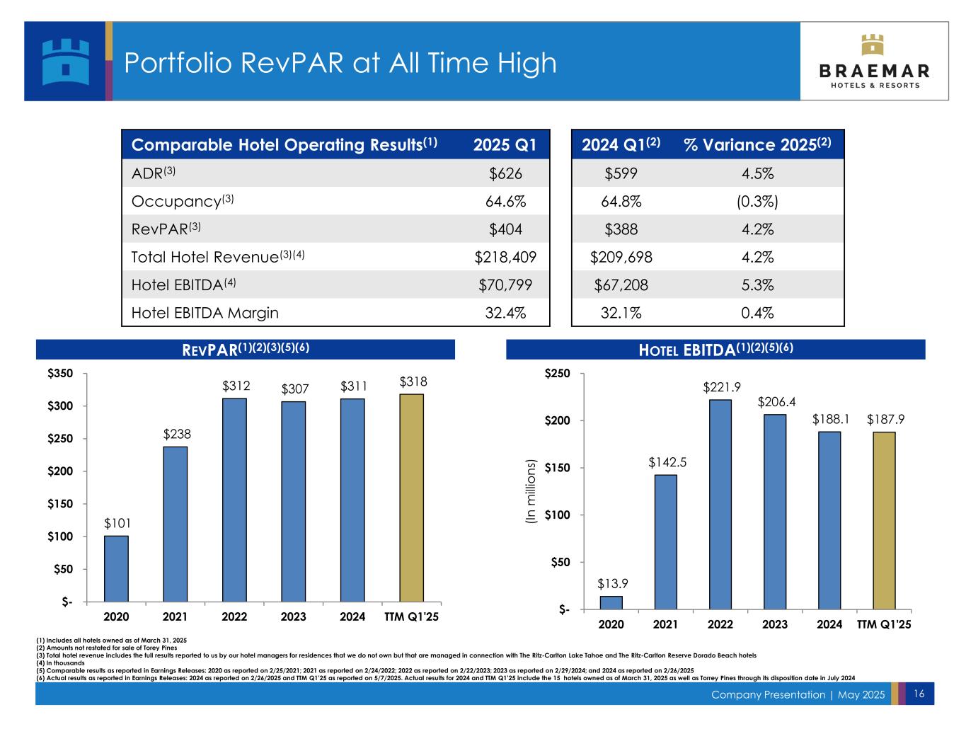 公司介绍| 2025年5月16日可比酒店经营业绩(1)2025年Q1 2024年Q1(2)%差异2025(2)ADR(3)$ 626 $ 5994.5%入住率(3)64.6% 64.8%(0.3%)RevPAR(3)$ 404 $ 3884.2%酒店总收入(3)(4)$ 218,409 $ 209,6984.2%酒店EBITDA(4)$ 70,799 $ 67,2085.3%酒店EBITDA利润率32.4% 32.1% 0.4%(1)包括截至3月31日拥有的所有酒店,2025(2)未重述的出售Torey Pines的金额(3)酒店总收入包括我们的酒店经理向我们报告的关于我们不拥有但与太浩湖丽思卡尔顿酒店和多拉多海滩丽思卡尔顿储备酒店相关的管理(4)(以千为单位)(5)收益发布中报告的可比结果:2021年2月25日报告的2020年;2022年2月24日报告的2021年;2023年2月22日报告的2022年;2024年2月29日报告的2023年;2025年2月26日报告的2024年(6)收益发布中报告的实际结果:2025年2月26日报告的2024年和2025年5月7日报告的TTM Q1’25。2024年和TTM Q1’25的实际业绩包括截至2025年3月31日拥有的15家酒店以及截至2024年7月处置日期的Torrey Pines酒店EBITDA(1)(2)(5)(6)REVPAR(1)(2)(3)(5)(6)投资组合RevPAR at All Time High $ 13.9 $ 142.5 $ 221.9 $ 206.4 $ 188.1 $ 187.9 $-$ 50 $ 100 $ 150 $ 200 $ 25020202021202220232024 TTM Q1‘25(in m illi on s)$ 101 $ 238 $ 312 $ 307 $ 311 $ 318 $-50 $ 100 $ 150 $ 200 $ 250 $ 300 $ 35020202021202220232024 TTM Q1’25