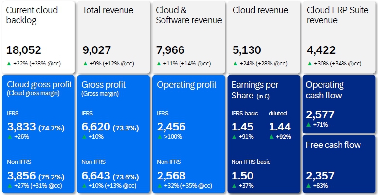 IFRS云毛利润增长26%至38.3亿欧元。非国际财务报告准则云毛利润增长27%至38.6亿欧元,按固定汇率计算增长31%。国际财务报告准则云毛利率上升1.8个百分点至74.7%,非国际财务报告准则云毛利率上升1.9个百分点至75.2%,按固定汇率计算上升1.8个百分点至75.0%。