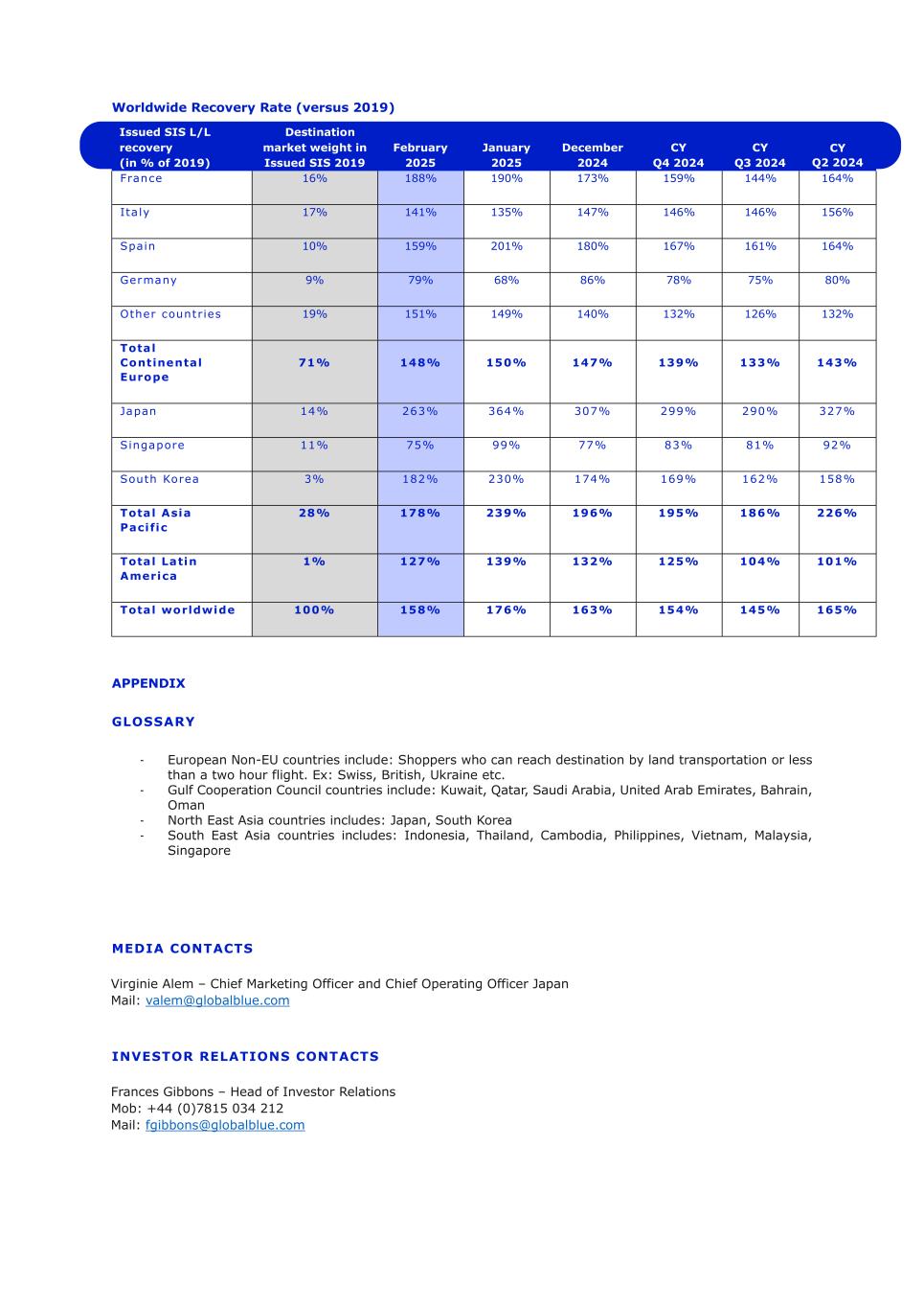 全球恢复率(与2019年相比)附录词汇表-欧洲非欧盟国家包括:可以通过陆运或不到两小时的飞行到达目的地的购物者。EX:瑞士、英国、乌克兰等-海湾阿拉伯国家合作委员会国家包括:科威特、卡塔尔、沙特阿拉伯、阿拉伯联合酋长国、巴林、阿曼-东北亚国家包括:日本、韩国-东南亚国家包括:印度尼西亚、泰国、柬埔寨、菲律宾、越南、马来西亚、新加坡媒体联系Virginie Alem –首席营销官和首席运营官Japan Mail:valem@globalblue.com投资者关系联系人Frances Gibbons –投资者关系主管Mob:+ 44(0)7815034212 Mail:fgibbons@globalblue.com issued SIS L/L recovery(in % of 2019)destination market weight in issued SIS 2019February 2025January 2025December 2024 CY Q4 2024 CY Q3 2024 CY Q2 2024法国16% 188% 190% 173% 159% 144% 164% ITA LY 17 % 141% 135% 147% 146% 146% 146% 156%西班牙10% 159% 2011% 180% 167% 164%德国9% 79% 68% 86% 78% 75% 80%其他国家19% 151% 149% 142% 132% 126% 132%欧洲大陆148% 150% 147% 139% 133% 143%日本14% 263% 364% 307% 299% 290% 327%新加坡11% 75% 99% 77% 83% 81% 92%韩国3% 182% 230% 174% 169% 162% 158%亚太地区合计28% 178% 239% 196% 195% 186% 226%拉丁美洲合计1% 127% 139% 132% 125% 104% 101%全球合计100% 158% 176% 163% 154% 145% 165%