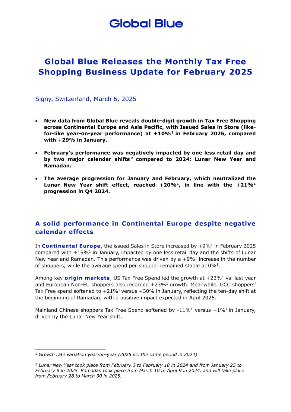 Global Blue发布2025年2月每月免税购物业务更新瑞士西格尼,2025年3月6日• Global Blue的新数据显示,整个欧洲大陆和亚太地区的免税购物实现了两位数的增长,2025年2月的商店发行销售额(同比表现)为+ 10% 1,而1月为+ 29%。•与2024年相比,2月的业绩受到了零售日减少一天和两个主要日历变化2的负面影响:农历新年和斋月。•抵消了春节换班效应的1月和2月平均进度达到+ 20% 1,与2024年Q4的+ 21% 1进度一致。尽管欧洲大陆受到负面日历影响,但在欧洲大陆表现稳健,2025年2月的门店已发行销售额较1月的+ 19% 1增长+ 9% 1,受零售日减少以及农历新年和斋月转移的影响。这一表现受到购物人数增长+ 9% 1的推动,而每位购物者的平均支出稳定在0% 1。在主要原产地市场中,美国免税支出以+ 23% 1的增幅领先,与去年相比,欧洲非欧盟购物者也录得+ 23% 1的增长。与此同时,海合会购物者的免税支出从1月份的+ 30%软化至+ 21% 1,这反映了斋月开始时的10天轮班,预计将在2025年4月产生积极影响。受农历新年转变的推动,中国大陆消费者的免税支出从1月份的+ 1%下降了-11 % 1。1同比增长率变化(2025年vs. 2024年同期)2农历新年发生在2024年的2月3日至2月18日,以及2025年的1月25日至2月9日。斋月于2024年3月10日至4月9日举行,并将于2025年2月28日至3月30日举行。