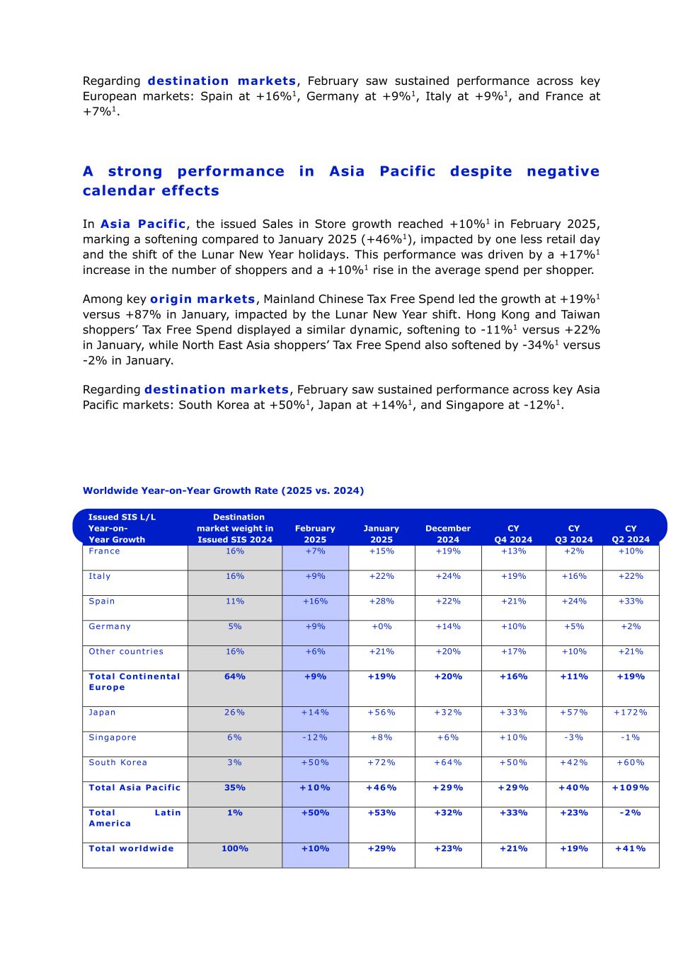 关于目的地市场,2月份欧洲主要市场表现持续:西班牙+ 16% 1,德国+ 9% 1,意大利+ 9% 1,法国+ 7% 1。亚太地区表现强劲,尽管亚太地区受到负面日历影响,但2025年2月门店已发行销售额增长达到+ 10% 1,与2025年1月(+ 46% 1)相比有所放缓,受零售日减少和农历新年假期转移的影响。这一业绩是由购物人数增长+ 17% 1和每位购物者的平均支出增长+ 10% 1推动的。在主要原产地市场中,受农历新年转变的影响,中国大陆免税支出以+ 19% 1的增幅领先,而1月份为+ 87%。香港和台湾消费者的免税支出显示出类似的动态,从1月份的+ 22%降至-11 % 1,而东北亚消费者的免税支出也从1月份的-2 %下降了-34 % 1。关于目的地市场,2月份主要亚太市场的表现持续:韩国为+ 50% 1,日本为+ 14% 1,新加坡为-12 % 1。全球同比增长率(2025年对比2024年)已发行SIS L/L同比增长目的地市场权重已发行SIS 2024 February 2025 January 2024 CY Q4 2024 CY Q3 2024 CY Q2 2024法国16% + 7% + 15% + 19% + 13% + 2% + 10% ITA LY 16 % + 9% + 22% + 24% + 19% + 22%西班牙11% + 16% + 28% + 22% + 21% + 24% + 33%德国5% + 9% +0% + 14% + 10% + 5% + 2%其他国家16% + 6% + 21% + 20% + 17% + 10% + 21%欧洲大陆合计64% + 9% + 19% + 20% + 16% + 11% + 19%日本26% + 14% ++ 6% + 10%-3 %-1 %韩国3% + 50% + 72% + 64% + 50% + 42% + 60%亚太合计35% + 10% + 46% + 29% + 29% + 40% + 109%拉丁美洲合计1% + 50% + 53% + 32% + 33% + 23%-2 %全球合计100% + 10% + 29% + 23% + 21% + 19% + 41%