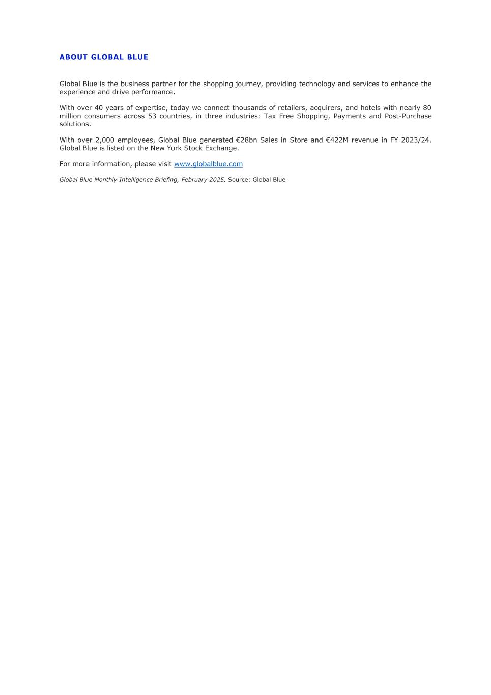 关于环球蓝Global Blue是购物之旅的业务合作伙伴,提供技术和服务来提升体验,驱动业绩。凭借40多年的专业知识,今天,我们将53个国家的数千家零售商、收单机构和酒店与近8000万消费者联系起来,涉及三个行业:免税购物、支付和购买后解决方案。Global Blue拥有超过2000名员工,在2023/24财年的门店销售额为280亿欧元,收入为4.22亿欧元。Global Blue在纽交所上市。欲了解更多信息,请登录www.globalblue.com丨Global Blue月度情报简报,2025年2月,来源:Global Blue